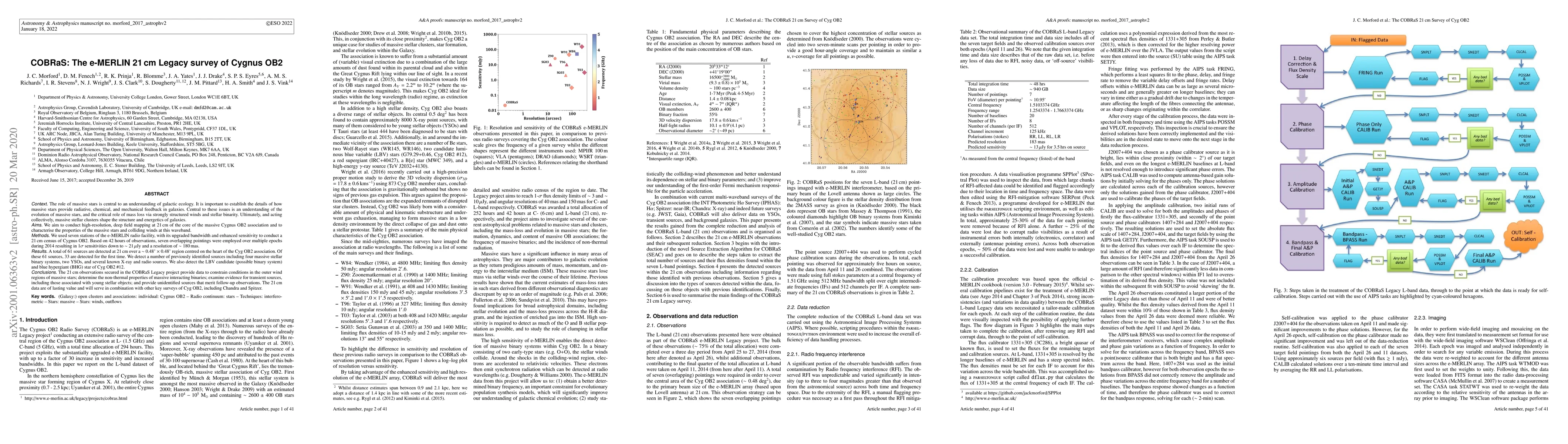 The COBRaS project used the e-MERLIN radio facility to conduct a high-resolution, deep 21cm field mapping of the Cygnus OB2 massive stellar association's core. With 42 hours of observations, they detected 61 radio sources, 33 of which were first-time discoveries. Notable detections include massive stellar binary systems, young stellar objects, known X-ray and radio sources, and the LBV candidate and blue hypergiant star of Cyg OB2 #12. The study aims to constrain outer wind conditions of massive stars, analyze non-thermal properties of binaries, examine transient sources, and provide data for further investigations.