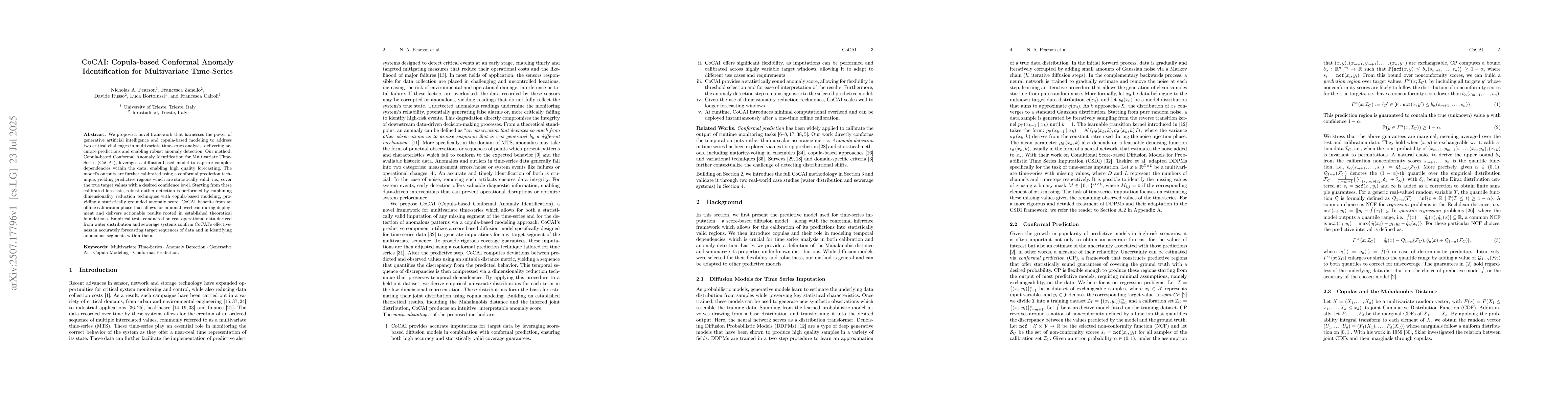 We propose a novel framework that harnesses the power of generative artificial intelligence and copula-based modeling to address two critical challenges in multivariate time-series analysis: delivering accurate predictions and enabling robust anomaly detection. Our method, Copula-based Conformal Anomaly Identification for Multivariate Time-Series (CoCAI), leverages a diffusion-based model to capture complex dependencies within the data, enabling high quality forecasting. The model's outputs are further calibrated using a conformal prediction technique, yielding predictive regions which are statistically valid, i.e., cover the true target values with a desired confidence level. Starting from these calibrated forecasts, robust outlier detection is performed by combining dimensionality reduction techniques with copula-based modeling, providing a statistically grounded anomaly score. CoCAI benefits from an offline calibration phase that allows for minimal overhead during deployment and delivers actionable results rooted in established theoretical foundations. Empirical tests conducted on real operational data derived from water distribution and sewerage systems confirm CoCAI's effectiveness in accurately forecasting target sequences of data and in identifying anomalous segments within them.