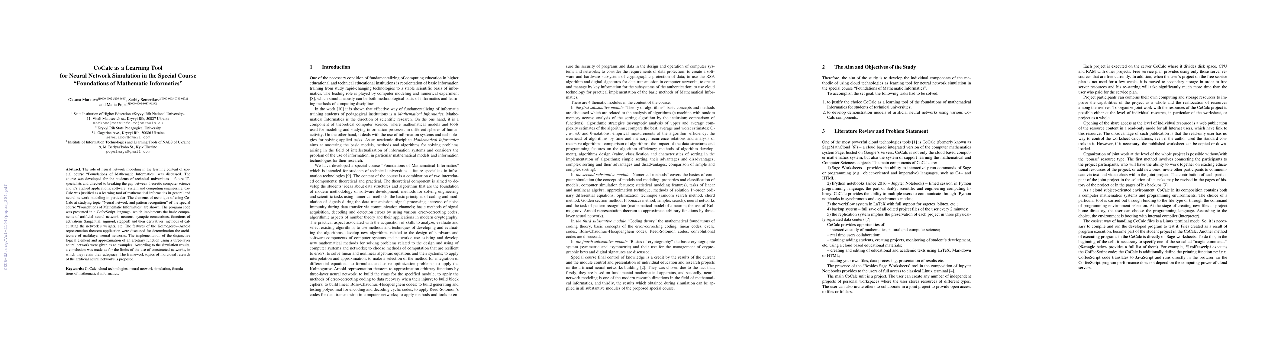 This paper explores the use of CoCalc as a learning tool for neural network simulation in the "Foundations of Mathematical Informatics" course, aimed at bridging theoretical computer science and its practical applications. It demonstrates how CoCalc facilitates the study of neural networks and pattern recognition, using CoffeeScript to implement neural network components and discusses the Kolmogorov-Arnold representation theorem for network architecture.