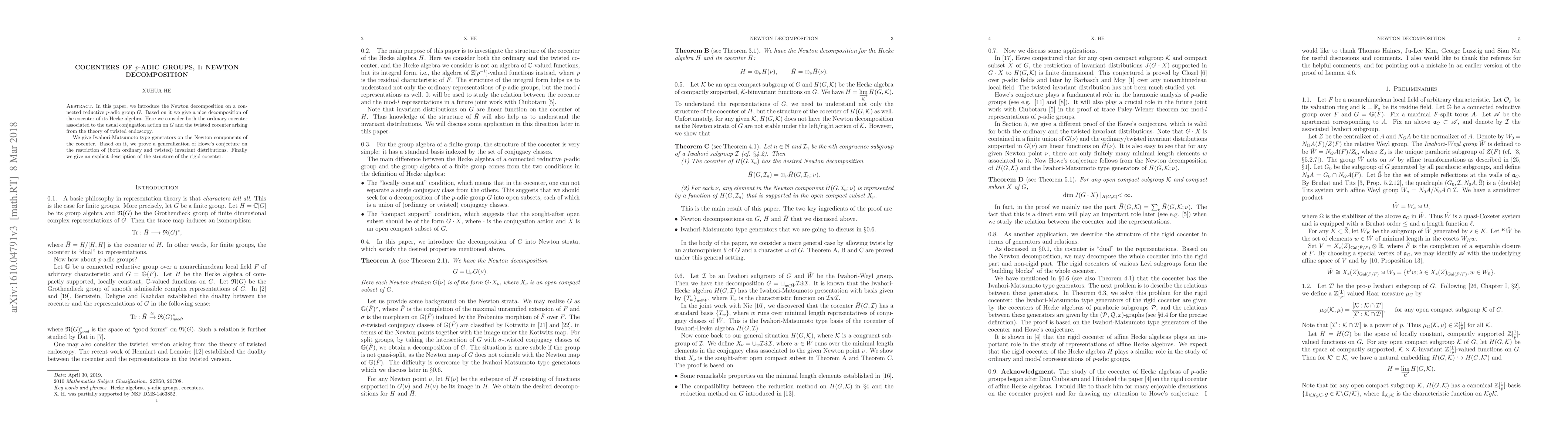 In this paper, we introduce the Newton decomposition on a connected reductive $p$-adic group $G$. Based on it we give a nice decomposition of the cocenter of its Hecke algebra. Here we consider both the ordinary cocenter associated to the usual conjugation action on $G$ and the twisted cocenter arising from the theory of twisted endoscopy. We give Iwahori-Matsumoto type generators on the Newton components of the cocenter. Based on it, we prove a generalization of Howe's conjecture on the restriction of (both ordinary and twisted) invariant distributions. Finally we give an explicit description of the structure of the rigid cocenter.