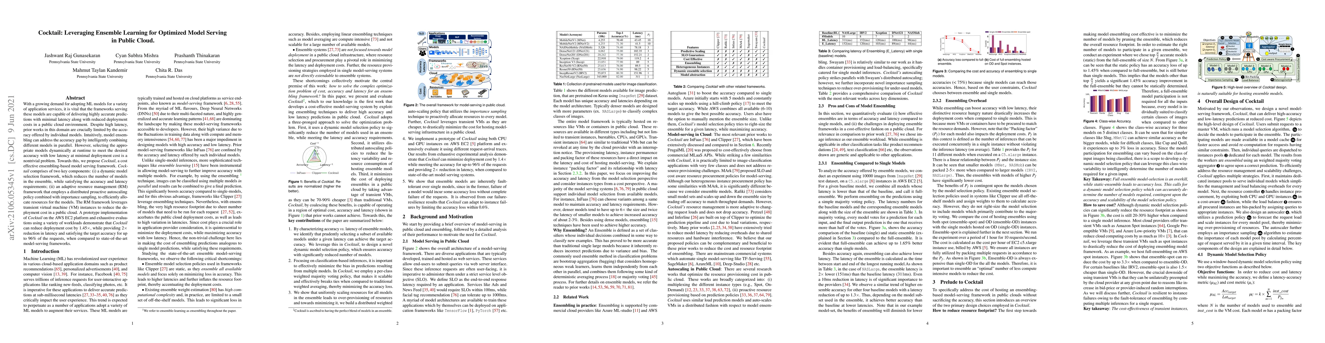 With a growing demand for adopting ML models for a varietyof application services, it is vital that the frameworks servingthese models are capable of delivering highly accurate predic-tions with minimal latency along with reduced deploymentcosts in a public cloud environment. Despite high latency,prior works in this domain are crucially limited by the accu-racy offered by individual models. Intuitively, model ensem-bling can address the accuracy gap by intelligently combiningdifferent models in parallel. However, selecting the appro-priate models dynamically at runtime to meet the desiredaccuracy with low latency at minimal deployment cost is anontrivial problem. Towards this, we proposeCocktail, a costeffective ensembling-based model serving framework.Cock-tailcomprises of two key components: (i) a dynamic modelselection framework, which reduces the number of modelsin the ensemble, while satisfying the accuracy and latencyrequirements; (ii) an adaptive resource management (RM)framework that employs a distributed proactive autoscalingpolicy combined with importance sampling, to efficiently allo-cate resources for the models. The RM framework leveragestransient virtual machine (VM) instances to reduce the de-ployment cost in a public cloud. A prototype implementationofCocktailon the AWS EC2 platform and exhaustive evalua-tions using a variety of workloads demonstrate thatCocktailcan reduce deployment cost by 1.45x, while providing 2xreduction in latency and satisfying the target accuracy for upto 96% of the requests, when compared to state-of-the-artmodel-serving frameworks.