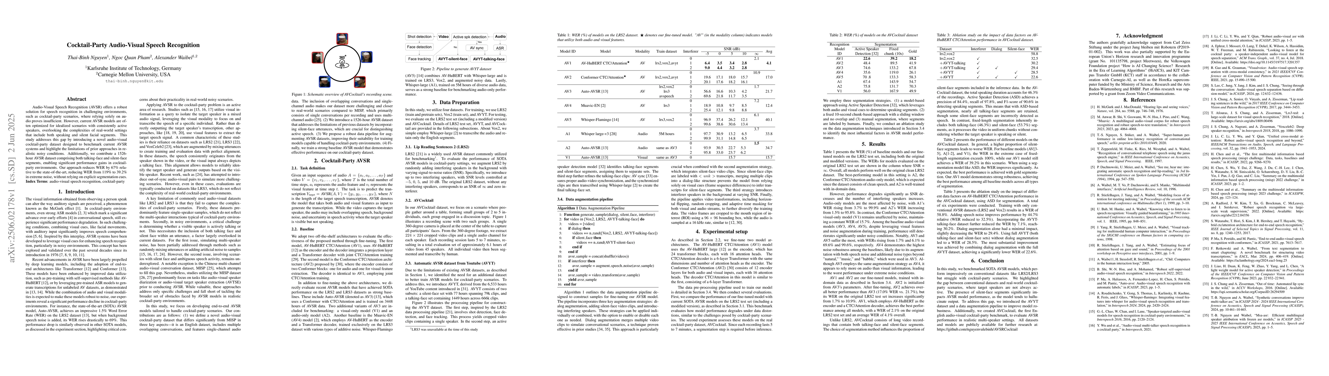 The paper presents a 1526-hour AVSR dataset and a novel approach that significantly improves speech recognition in cocktail-party scenarios without relying on explicit segmentation cues.