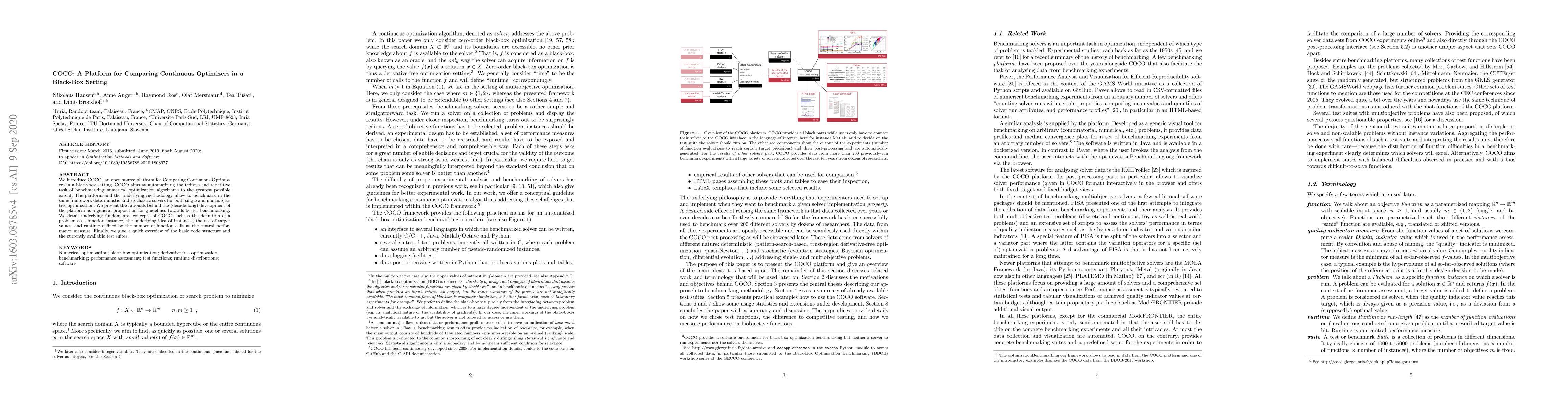 We introduce COCO, an open source platform for Comparing Continuous Optimizers in a black-box setting. COCO aims at automatizing the tedious and repetitive task of benchmarking numerical optimization algorithms to the greatest possible extent. The platform and the underlying methodology allow to benchmark in the same framework deterministic and stochastic solvers for both single and multiobjective optimization. We present the rationales behind the (decade-long) development of the platform as a general proposition for guidelines towards better benchmarking. We detail underlying fundamental concepts of COCO such as the definition of a problem as a function instance, the underlying idea of instances, the use of target values, and runtime defined by the number of function calls as the central performance measure. Finally, we give a quick overview of the basic code structure and the currently available test suites.