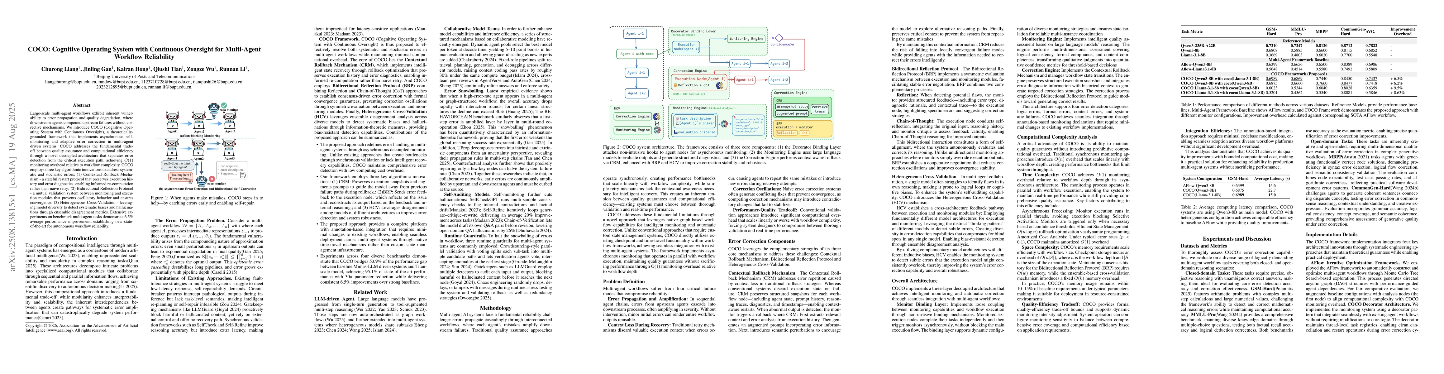 Large-scale multi-agent workflows exhibit inherent vulnerability to error propagation and quality degradation, where downstream agents compound upstream failures without corrective mechanisms. We introduce COCO (Cognitive Operating System with Continuous Oversight), a theoretically-grounded framework that implements asynchronous self-monitoring and adaptive error correction in multi-agent driven systems. COCO addresses the fundamental trade-off between quality assurance and computational efficiency through a novel decoupled architecture that separates error detection from the critical execution path, achieving $O(1)$ monitoring overhead relative to workflow complexity. COCO employs three key algorithmic innovations to address systematic and stochastic errors: (1) Contextual Rollback Mechanism - a stateful restart protocol that preserves execution history and error diagnostics, enabling informed re-computation rather than naive retry; (2) Bidirectional Reflection Protocol - a mutual validation system between monitoring and execution modules that prevents oscillatory behavior and ensures convergence; (3) Heterogeneous Cross-Validation - leveraging model diversity to detect systematic biases and hallucinations through ensemble disagreement metrics. Extensive experiments on benchmark multi-agent tasks demonstrate 6.5\% average performance improvement, establishing new state-of-the-art for autonomous workflow reliability.