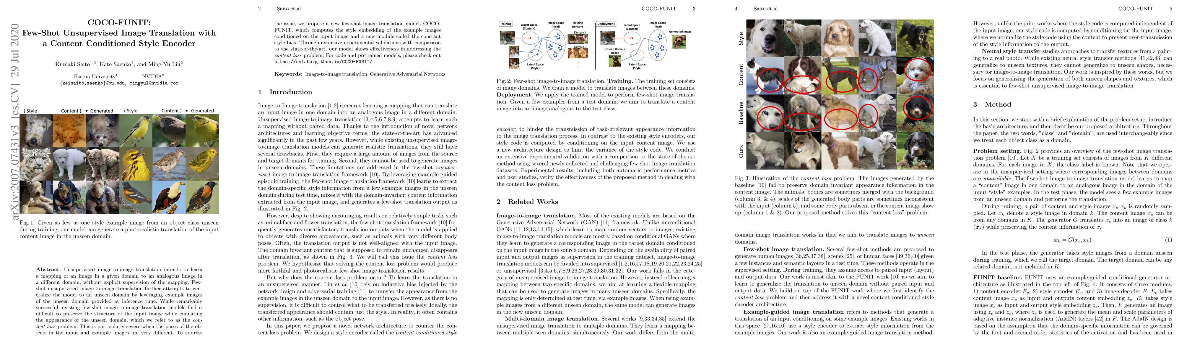 COCO-FUNIT introduces a novel few-shot unsupervised image translation method that addresses the content loss problem by embedding style from example images conditioned on the input image, using a constant style bias module. Experimental results demonstrate its effectiveness in preserving input image structure while adapting to new domains.