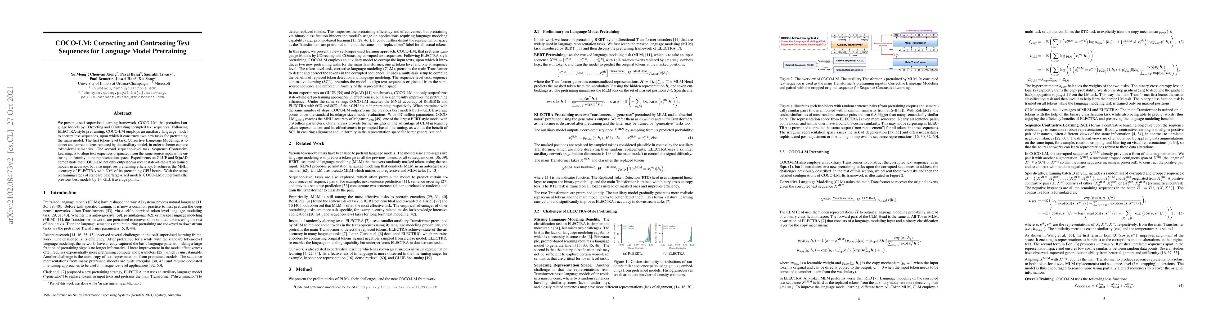 COCO-LM introduces a self-supervised learning framework that pretrains language models by correcting and contrasting corrupted text sequences, achieving superior performance on GLUE and SQuAD benchmarks while significantly improving pretraining efficiency.
