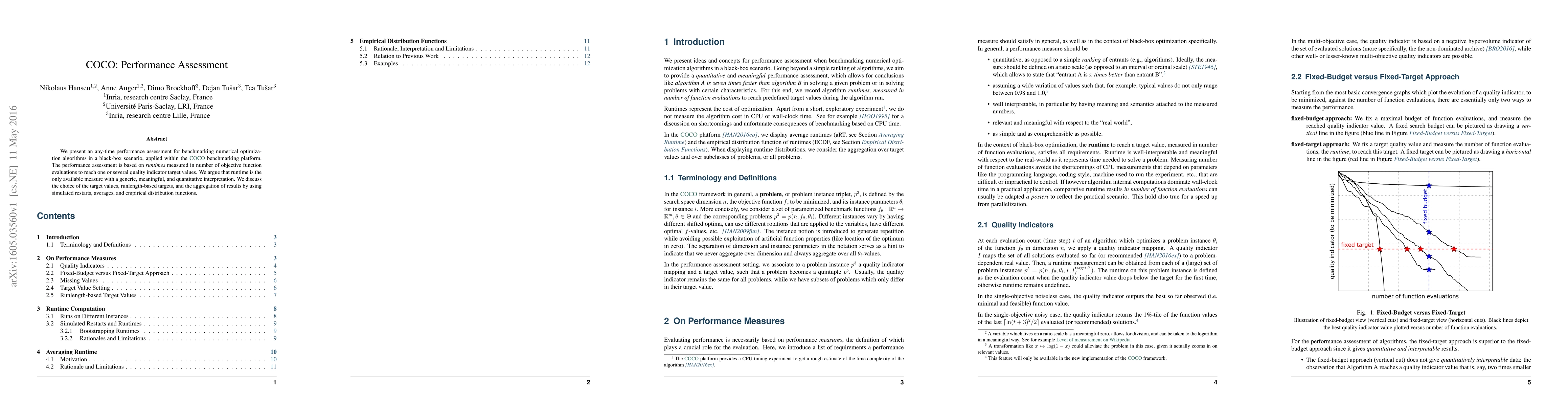 We present an any-time performance assessment for benchmarking numerical optimization algorithms in a black-box scenario, applied within the COCO benchmarking platform. The performance assessment is based on runtimes measured in number of objective function evaluations to reach one or several quality indicator target values. We argue that runtime is the only available measure with a generic, meaningful, and quantitative interpretation. We discuss the choice of the target values, runlength-based targets, and the aggregation of results by using simulated restarts, averages, and empirical distribution functions.