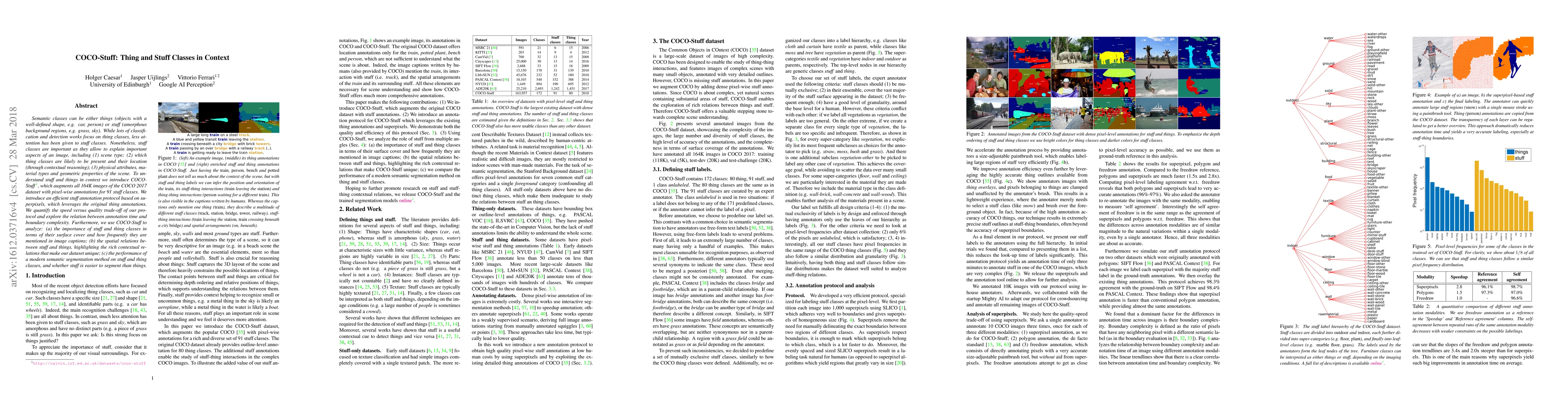 This paper introduces COCO-Stuff, a dataset that adds pixel-wise annotations for 91 stuff classes to the COCO 2017 dataset, enabling more comprehensive analysis of semantic classes in context.