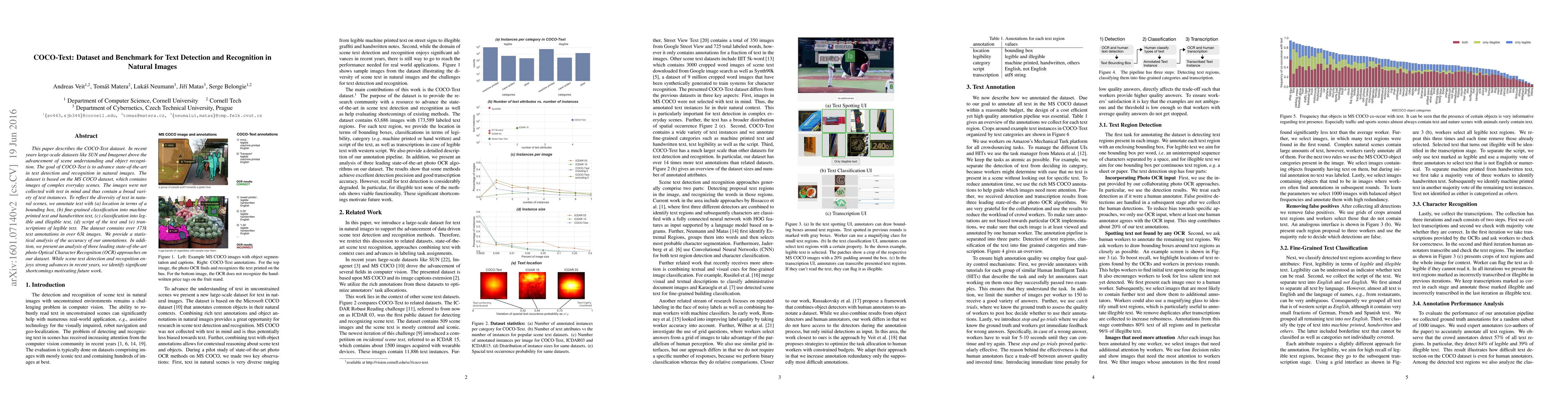 The COCO-Text dataset aims to advance text detection and recognition in natural images, featuring over 173k annotations in 63k images, and includes detailed text classifications and transcriptions. An analysis of current OCR approaches highlights remaining challenges in this field.