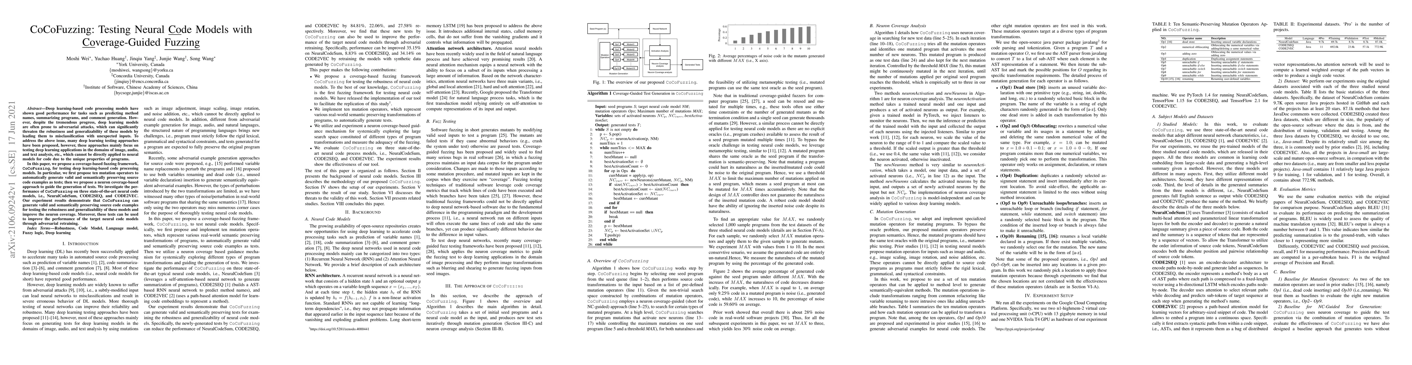CoCoFuzzing introduces a coverage-guided fuzzing framework to test neural code models, employing ten mutation operators to generate valid test cases. Experiments show that CoCoFuzzing enhances neuron coverage and robustness, improving the performance of neural code models through adversarial retraining.