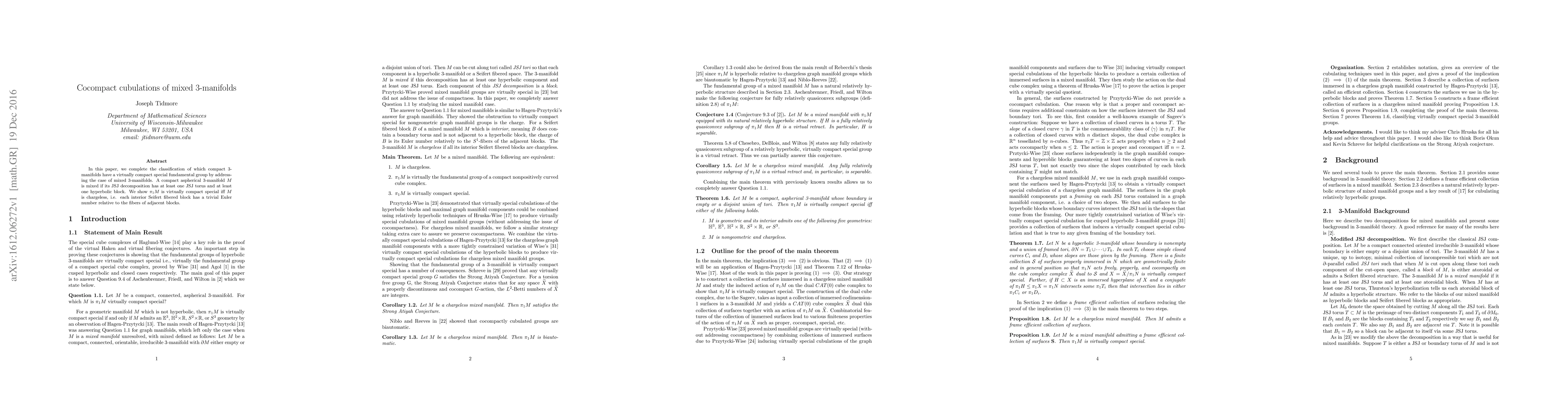 This paper classifies compact 3-manifolds with virtually compact special fundamental groups, focusing on mixed manifolds that contain both JSJ tori and hyperbolic components. It concludes that such a manifold's fundamental group is virtually compact special if and only if it is chargeless, meaning each interior Seifert fibered block has a trivial Euler number relative to adjacent fibers.