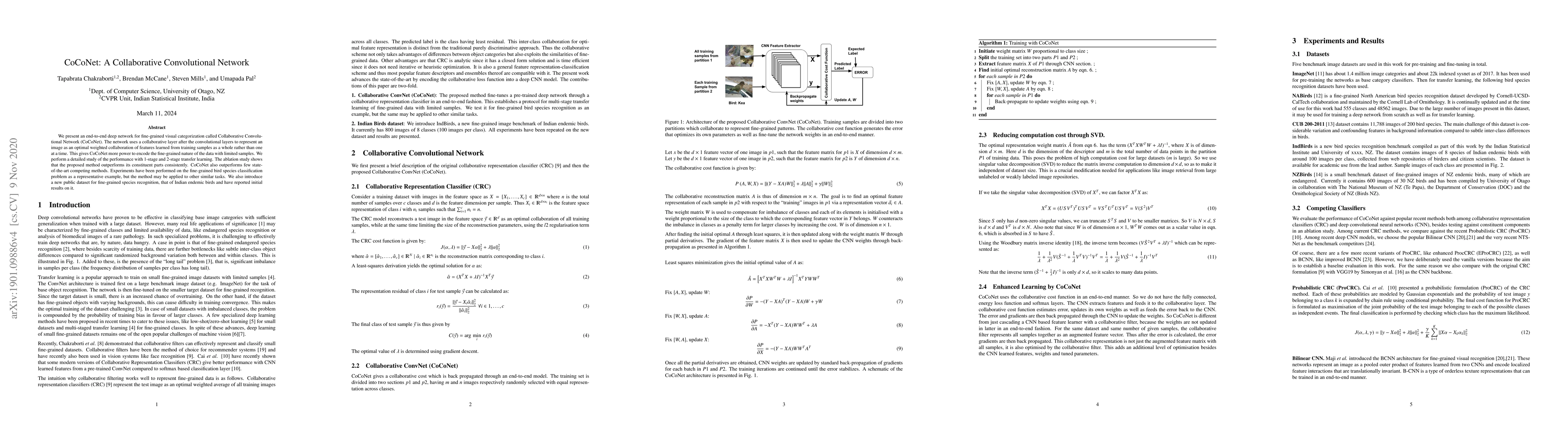We present an end-to-end deep network for fine-grained visual categorization called Collaborative Convolutional Network (CoCoNet). The network uses a collaborative layer after the convolutional layers to represent an image as an optimal weighted collaboration of features learned from training samples as a whole rather than one at a time. This gives CoCoNet more power to encode the fine-grained nature of the data with limited samples. We perform a detailed study of the performance with 1-stage and 2-stage transfer learning. The ablation study shows that the proposed method outperforms its constituent parts consistently. CoCoNet also outperforms few state-of-the-art competing methods. Experiments have been performed on the fine-grained bird species classification problem as a representative example, but the method may be applied to other similar tasks. We also introduce a new public dataset for fine-grained species recognition, that of Indian endemic birds and have reported initial results on it.