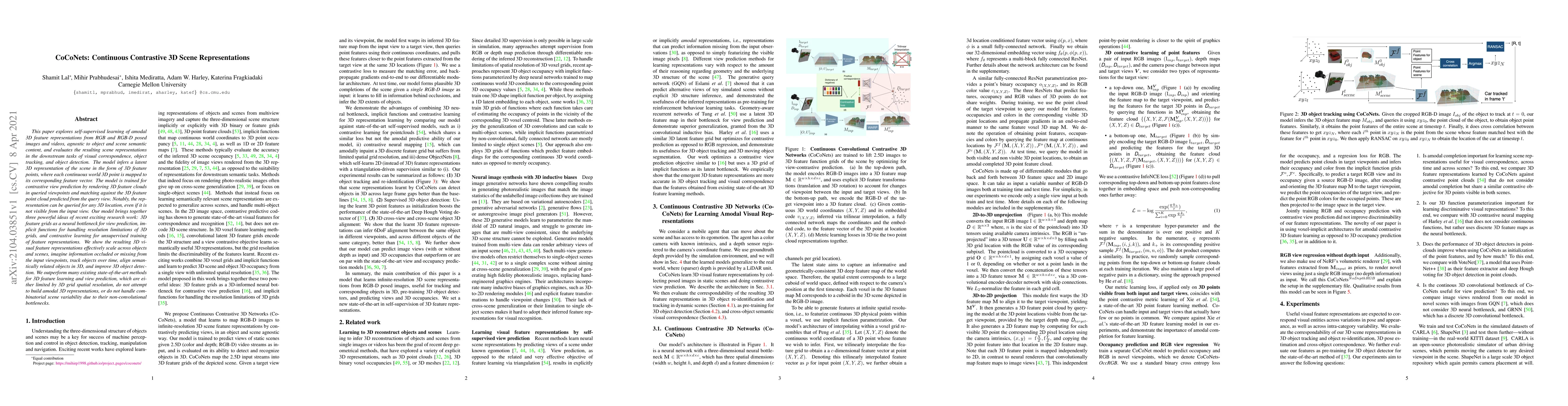This paper introduces CoCoNets, a self-supervised learning model for amodal 3D feature representations from RGB and RGB-D data, achieving superior performance in visual correspondence, object tracking, and object detection through contrastive view prediction and 3D feature point clouds. The model outperforms existing methods by effectively scaling across objects and scenes, handling occlusions, and managing scene variability.