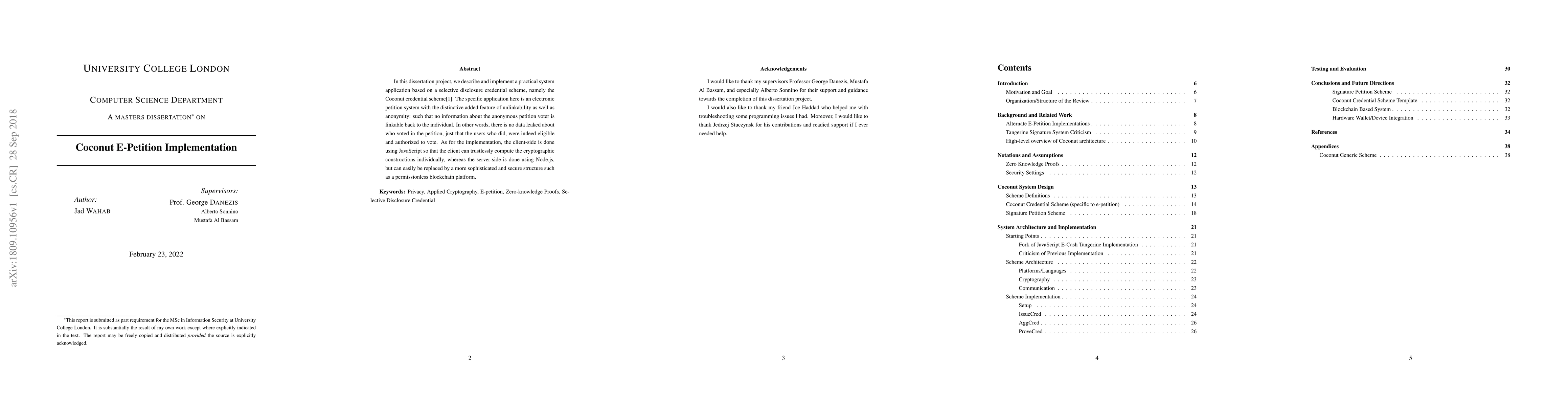 This paper presents an electronic petition system utilizing the Coconut credential scheme for unlinkable and anonymous voting, implemented with JavaScript for client-side computations and Node.js for the server-side, with potential for blockchain integration. The system ensures no linkable data about individual voters is revealed, only their eligibility and authorization.