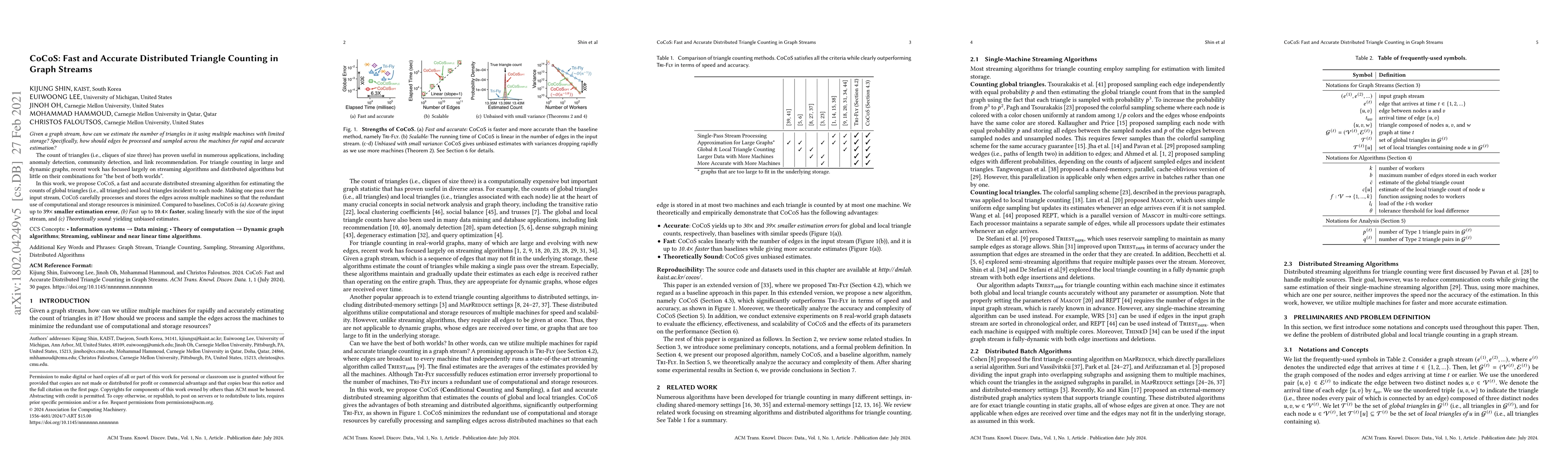 CoCoS is a distributed streaming algorithm designed for rapid and accurate triangle counting in large graph streams. It minimizes redundant computational and storage use across multiple machines, achieving up to 39X smaller estimation error and 10.4X faster processing compared to baselines.