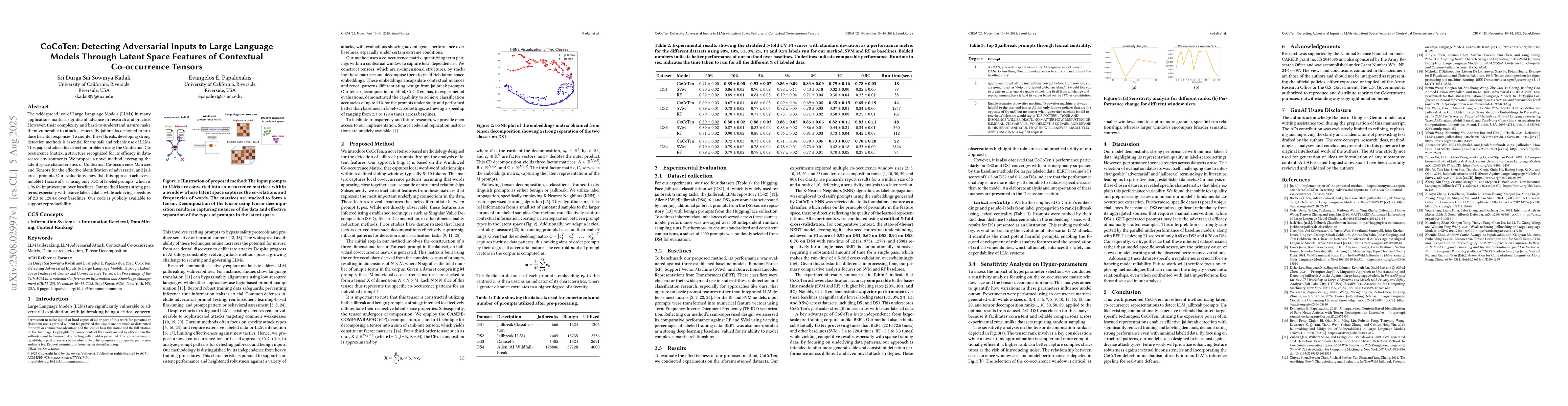 The widespread use of Large Language Models (LLMs) in many applications marks a significant advance in research and practice. However, their complexity and hard-to-understand nature make them vulnerable to attacks, especially jailbreaks designed to produce harmful responses. To counter these threats, developing strong detection methods is essential for the safe and reliable use of LLMs. This paper studies this detection problem using the Contextual Co-occurrence Matrix, a structure recognized for its efficacy in data-scarce environments. We propose a novel method leveraging the latent space characteristics of Contextual Co-occurrence Matrices and Tensors for the effective identification of adversarial and jailbreak prompts. Our evaluations show that this approach achieves a notable F1 score of 0.83 using only 0.5% of labeled prompts, which is a 96.6% improvement over baselines. This result highlights the strength of our learned patterns, especially when labeled data is scarce. Our method is also significantly faster, speedup ranging from 2.3 to 128.4 times compared to the baseline models. To support future research and reproducibility, we have made our implementation publicly available.