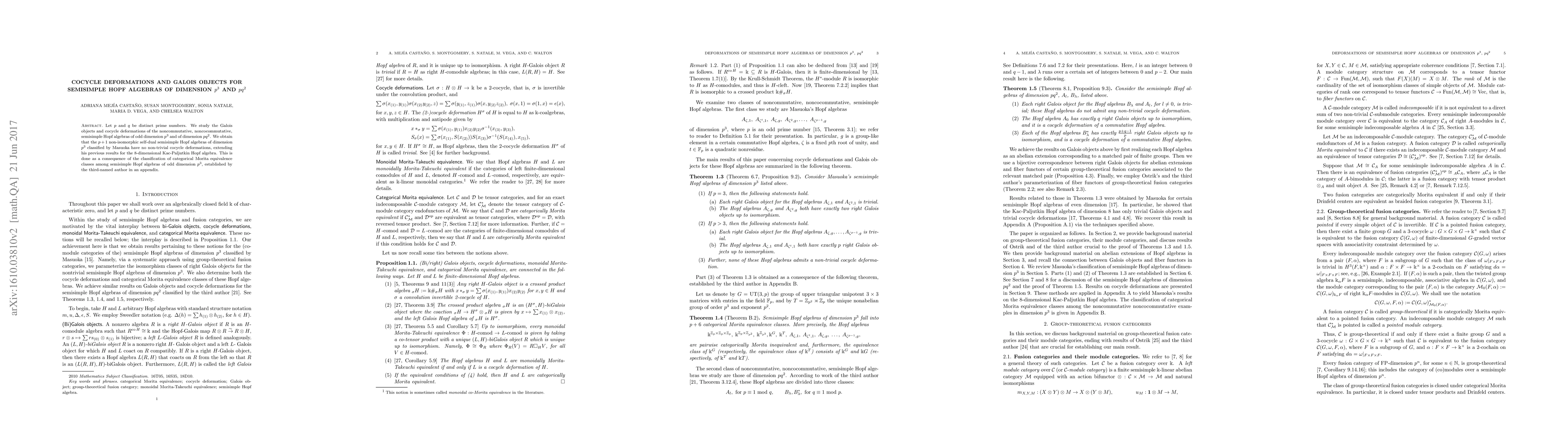 Let $p$ and $q$ be distinct prime numbers. We study the Galois objects and cocycle deformations of the noncommutative, noncocommutative, semisimple Hopf algebras of odd dimension $p^3$ and of dimension $pq^2$. We obtain that the $p+1$ non-isomorphic self-dual semisimple Hopf algebras of dimension $p^3$ classified by Masuoka have no non-trivial cocycle deformations, extending his previous results for the 8-dimensional Kac-Paljutkin Hopf algebra. This is done as a consequence of the classification of categorical Morita equivalence classes among semisimple Hopf algebras of odd dimension $p^3$, established by the third-named author in an appendix.
