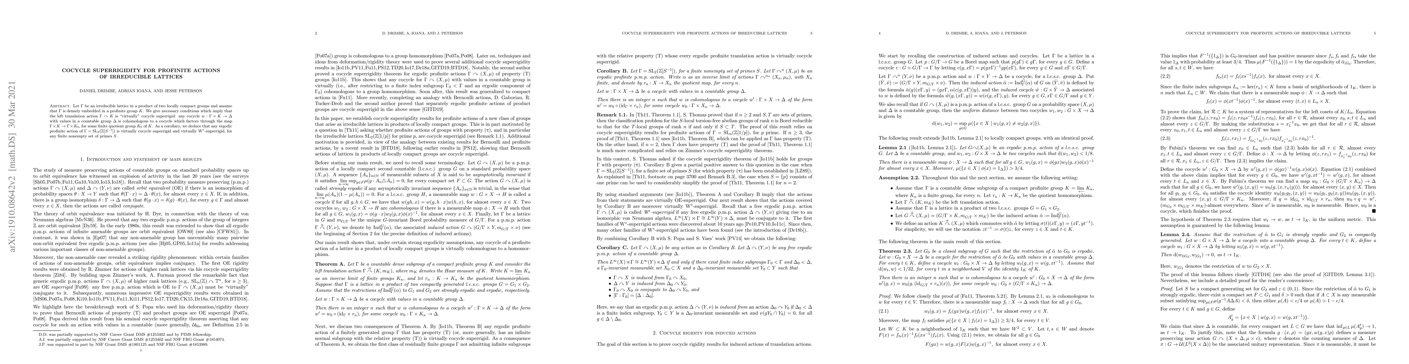 Let $\Gamma$ be an irreducible lattice in a product of two locally compact groups and assume that $\Gamma$ is densely embedded in a profinite group $K$. We give necessary conditions which imply that the left translation action $\Gamma\curvearrowright K$ is "virtually" cocycle superrigid: any cocycle $w:\Gamma\times K\rightarrow\Delta$ with values in a countable group $\Delta$ is cohomologous to a cocycle which factors through the map $\Gamma\times K\rightarrow\Gamma\times K_0$, for some finite quotient group $K_0$ of $K$. As a corollary, we deduce that any ergodic profinite action of $\Gamma=\text{SL}_2(\mathbb Z[S^{-1}])$ is virtually cocycle superrigid and virtually W$^*$-superrigid, for any finite nonempty set of primes $S$.