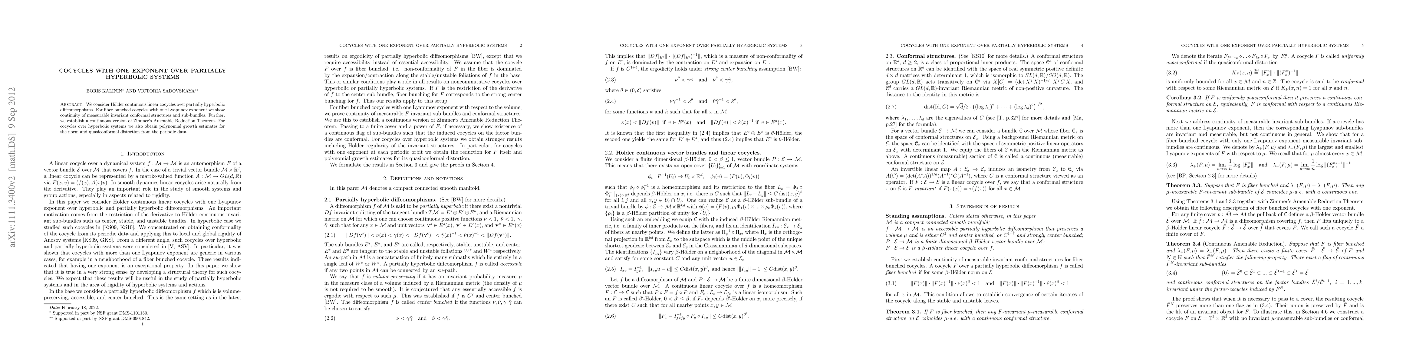 This paper investigates Holder continuous linear cocycles over partially hyperbolic diffeomorphisms, proving continuity of invariant conformal structures and sub-bundles for cocycles with one Lyapunov exponent. It also establishes a continuous version of Zimmer's Amenable Reduction Theorem and provides polynomial growth estimates for norms and quasiconformal distortion in hyperbolic systems.