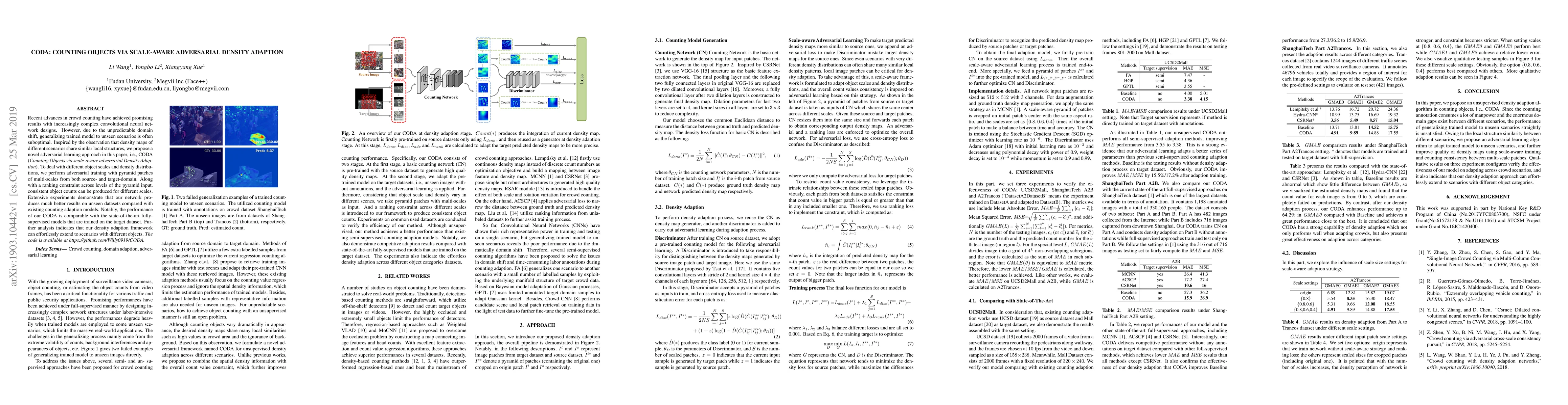 The paper introduces CODA, a novel adversarial learning approach for crowd counting that employs scale-aware density adaption to handle domain shifts and improve generalization. The method uses multi-scale adversarial training and a ranking constraint to produce consistent object counts across different scales, achieving state-of-the-art performance on unseen datasets.