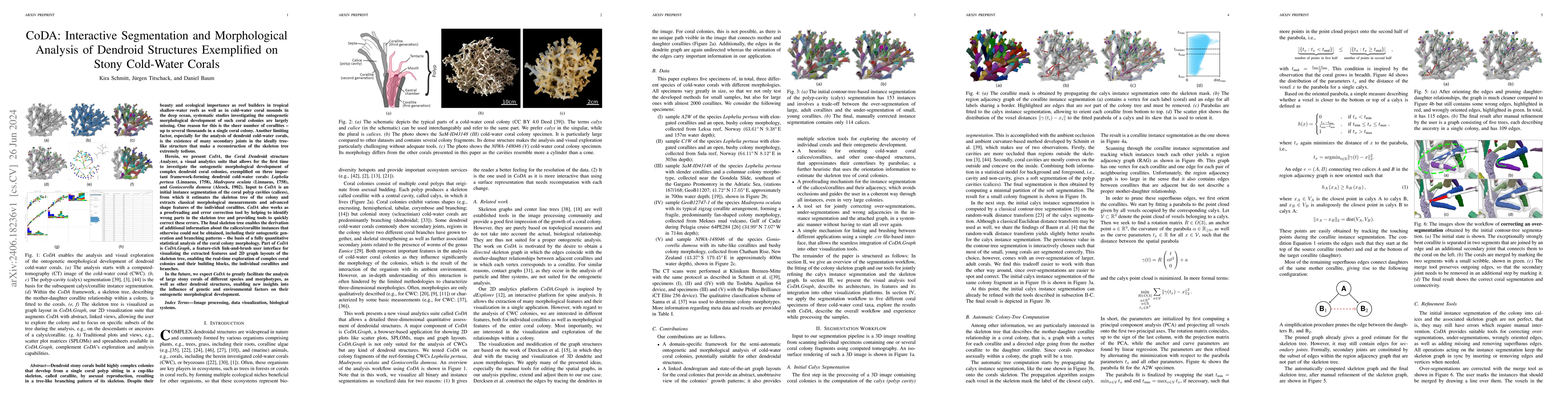 CoDA is a visual analytics tool for analyzing the morphological development of dendroid coral colonies, particularly focusing on cold-water corals like Lophelia pertusa, Madrepora oculata, and Goniocorella dumosa. It facilitates the extraction of morphological measurements and advanced shape features from segmented coral skeletons, providing error correction and quantitative analysis capabilities.
