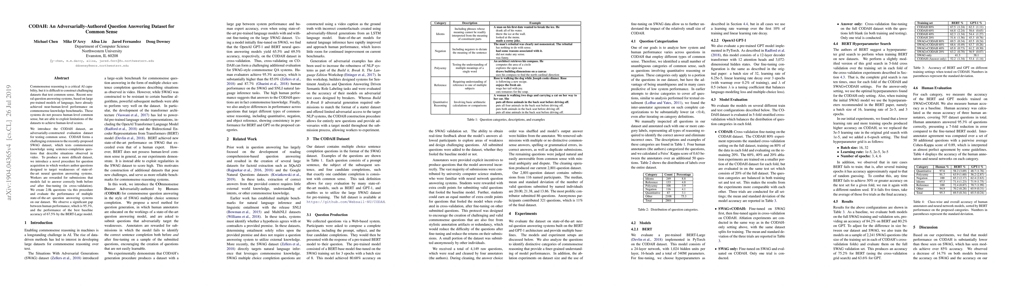 CODAH is an adversarially authored question-answer dataset designed to test common sense, showing a significant gap between human and machine performance, highlighting the limitations of current neural question answering systems. The dataset was created by workers crafting questions that expose weaknesses in state-of-the-art models, resulting in a challenging extension to existing benchmarks.