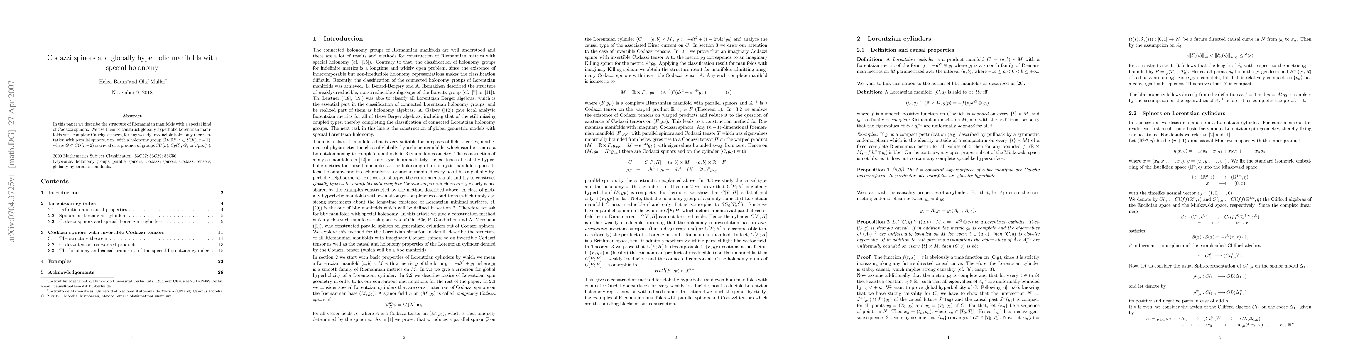 The paper examines Riemannian manifolds with special Codazzi tensors, constructing globally hyperbolic Lorentzian manifolds with complete Cauchy hypersurfaces using weakly irreducible holonomy representations with parallel spinors.