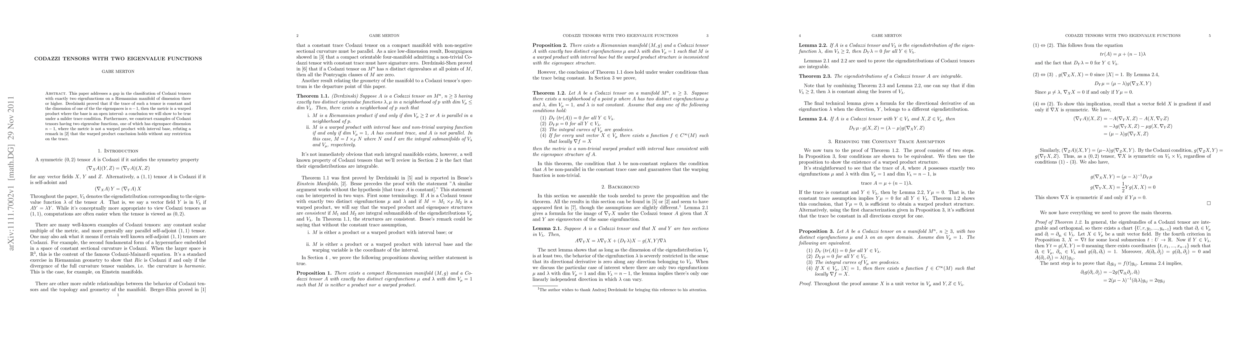 This paper addresses a gap in the classifcation of Codazzi tensors with exactly two eigenfunctions on a Riemannian manifold of dimension three or higher. Derdzinski proved that if the trace of such a tensor is constant and the dimension of one of the the eigenspaces is $n-1$, then the metric is a warped product where the base is an open interval- a conclusion we will show to be true under a milder trace condition. Furthermore, we construct examples of Codazzi tensors having two eigenvalue functions, one of which has eigenspace dimension $n-1$, where the metric is not a warped product with interval base, refuting a remark in \cite{Besse} that the warped product conclusion holds without any restriction on the trace.