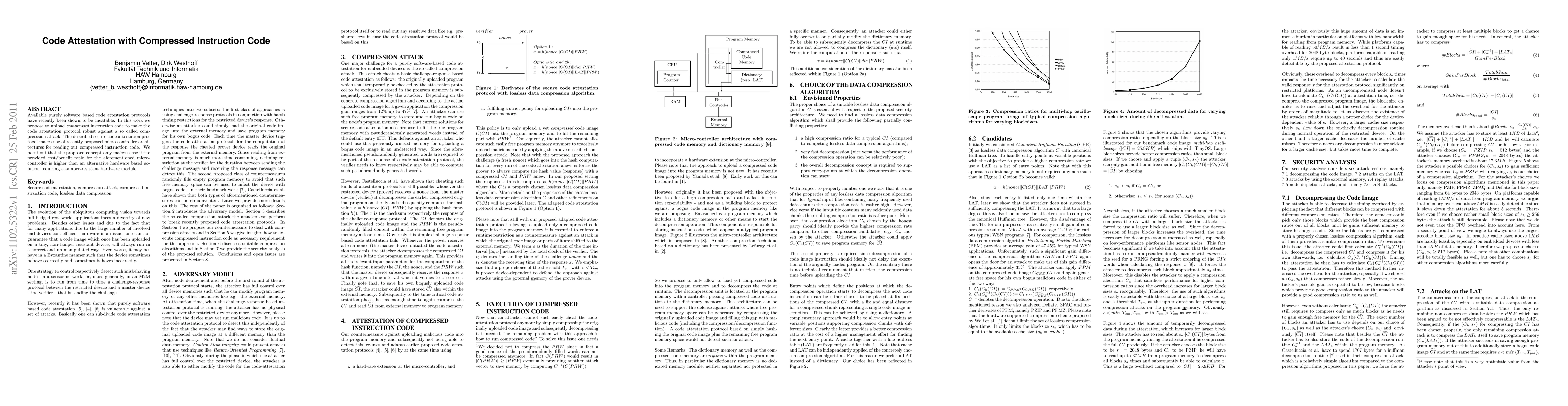 This paper proposes a robust code attestation protocol using compressed instruction code, leveraging new microcontroller architectures to resist compression attacks. It argues that this approach is viable only if the cost/benefit ratio of the new microcontrollers is more favorable than traditional hardware-based solutions with tamper-resistant modules.