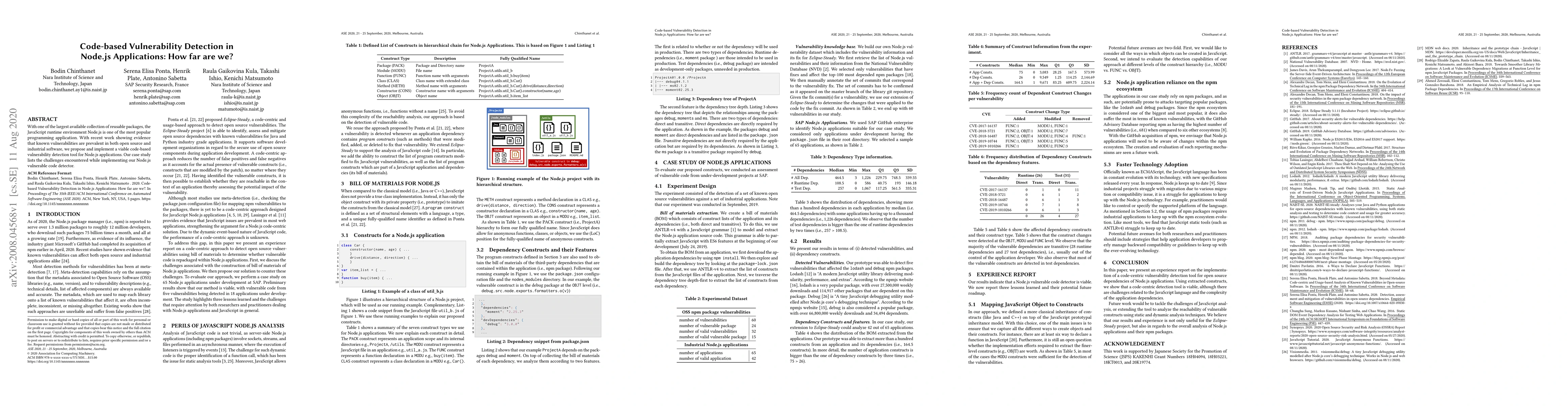 This paper proposes and implements a code-based vulnerability detection tool for Node.js applications, highlighting the challenges encountered during its development and emphasizing the prevalence of known vulnerabilities in software.