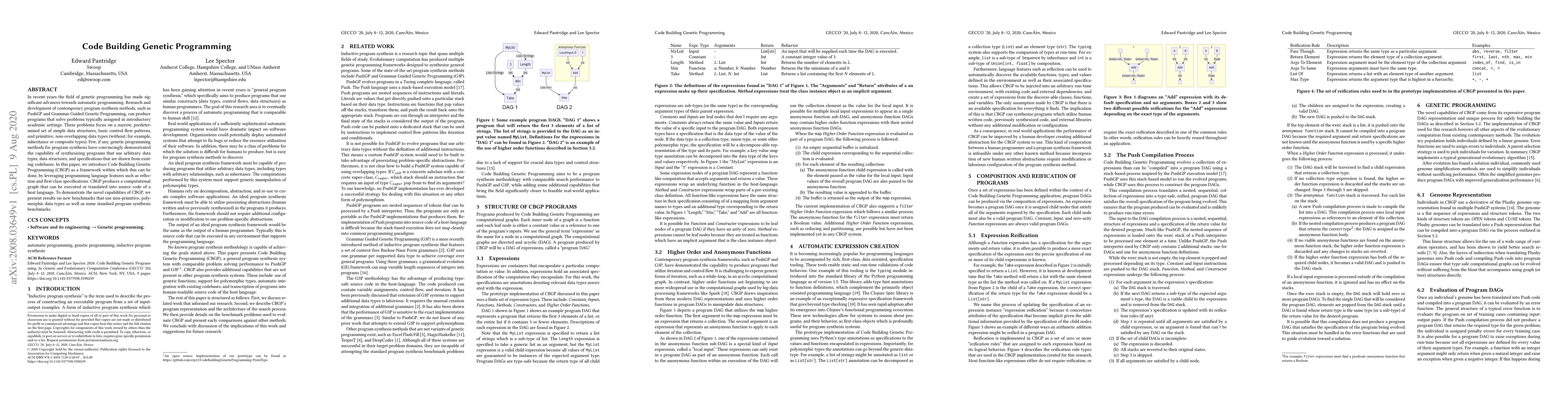 This paper introduces Code Building Genetic Programming (CBGP), a framework that leverages reflection and first-class specifications to synthesize programs using arbitrary data types and structures from existing codebases. CBGP produces executable computational graphs or translatable source code, demonstrated through benchmarks involving polymorphic data types and standard program synthesis tasks.