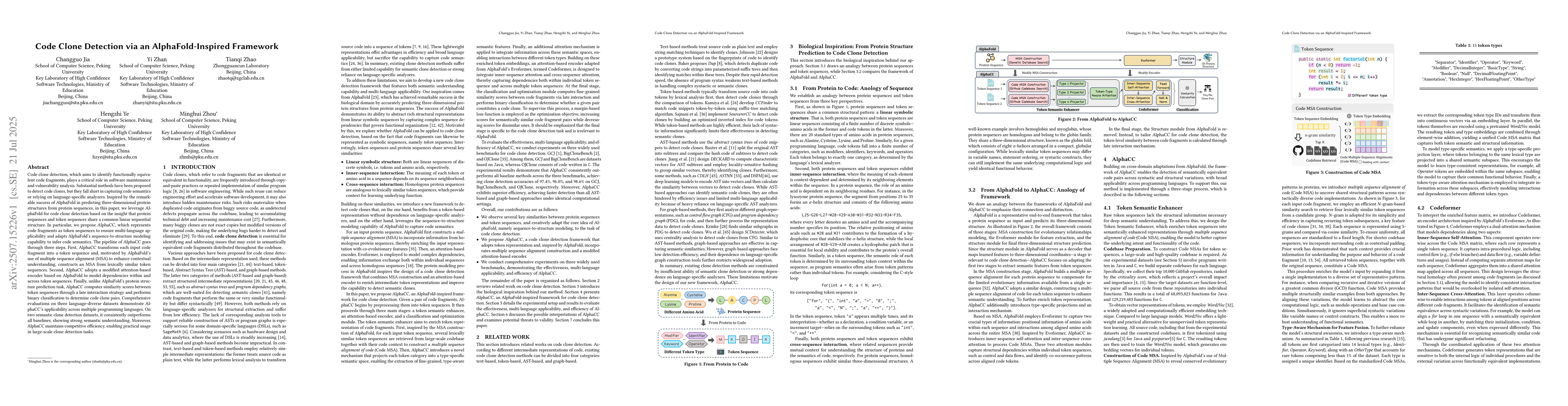 Code clone detection, which aims to identify functionally equivalent code fragments, plays a critical role in software maintenance and vulnerability analysis. Substantial methods have been proposed to detect code clones, but they fall short in capturing code semantics or relying on language-specific analyzers. Inspired by the remarkable success of AlphaFold in predicting three-dimensional protein structures from protein sequences, in this paper, we leverage AlphaFold for code clone detection based on the insight that protein sequences and token sequences share a common linear sequential structure. In particular, we propose AlphaCC, which represents code fragments as token sequences to ensure multi-language applicability and adapts AlphaFold's sequence-to-structure modeling capability to infer code semantics. The pipeline of AlphaCC goes through three steps. First, AlphaCC transforms each input code fragment into a token sequence and, motivated by AlphaFold's use of multiple sequence alignment (MSA) to enhance contextual understanding, constructs an MSA from lexically similar token sequences. Second, AlphaCC adopts a modified attention-based encoder based on AlphaFold to model dependencies within and across token sequences. Finally, unlike AlphaFold's protein structure prediction task, AlphaCC computes similarity scores between token sequences through a late interaction strategy and performs binary classification to determine code clone pairs. Comprehensive evaluations on three language-diverse datasets demonstrate AlphaCC's applicability across multiple programming languages. On two semantic clone detection datasets, it consistently outperforms all baselines, showing strong semantic understanding. Moreover, AlphaCC maintains competitive efficiency, enabling practical usage in large-scale clone detection tasks.