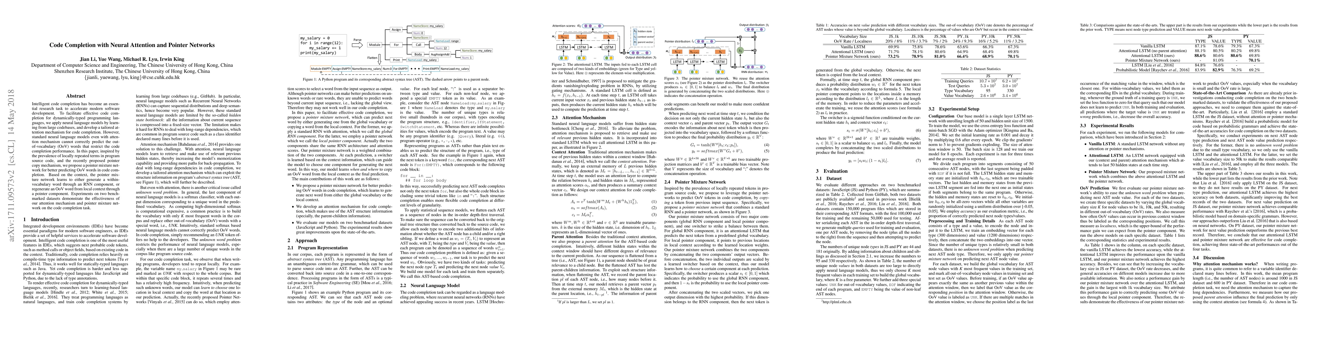 This paper proposes a pointer mixture network combining neural attention and pointer networks to enhance code completion for dynamically-typed languages, addressing out-of-vocabulary word prediction issues by either generating or copying relevant terms from the local context. Experimental results show improved performance on benchmark datasets.