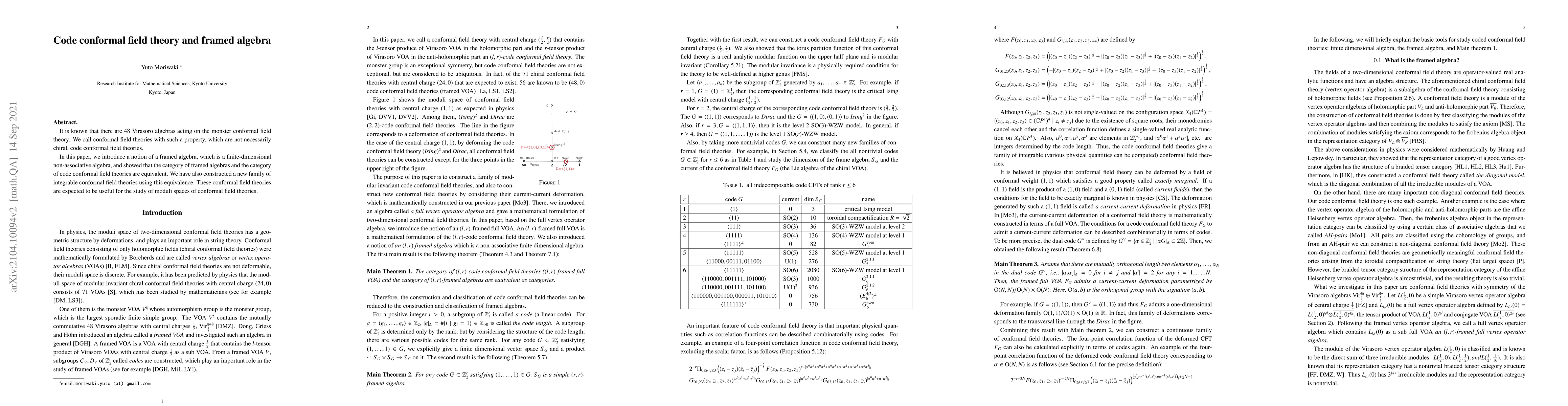 It is known that there are 48 Virasoro algebras acting on the monster conformal field theory. We call conformal field theories with such a property, which are not necessarily chiral, code conformal field theories. In this paper, we introduce a notion of a framed algebra, which is a finite-dimensional non-associative algebra, and showed that the category of framed algebras and the category of code conformal field theories are equivalent. We have also constructed a new family of integrable conformal field theories using this equivalence. These conformal field theories are expected to be useful for the study of moduli spaces of conformal field theories.