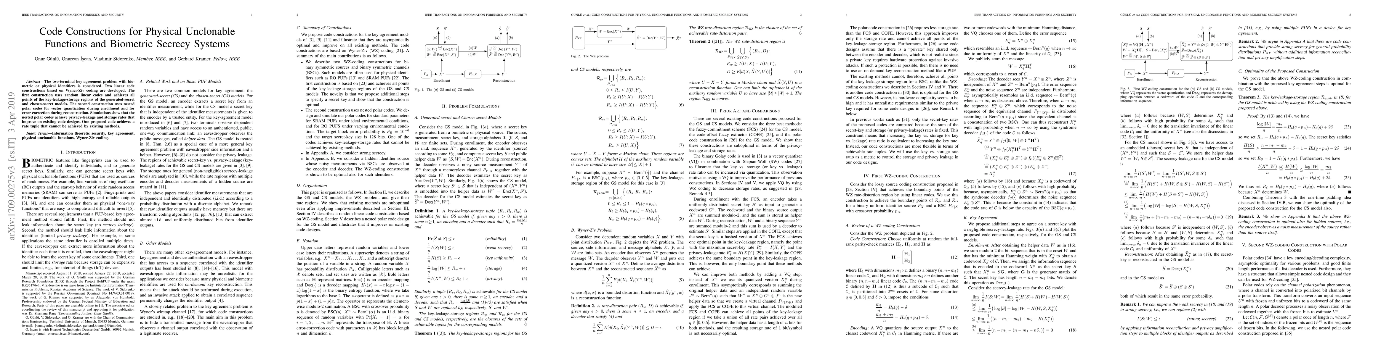 The two-terminal key agreement problem with biometric or physical identifiers is considered. Two linear code constructions based on Wyner-Ziv coding are developed. The first construction uses random linear codes and achieves all points of the key-leakage-storage regions of the generated-secret and chosen-secret models. The second construction uses nested polar codes for vector quantization during enrollment and for error correction during reconstruction. Simulations show that the nested polar codes achieve privacy-leakage and storage rates that improve on existing code designs. One proposed code achieves a rate tuple that cannot be achieved by existing methods.