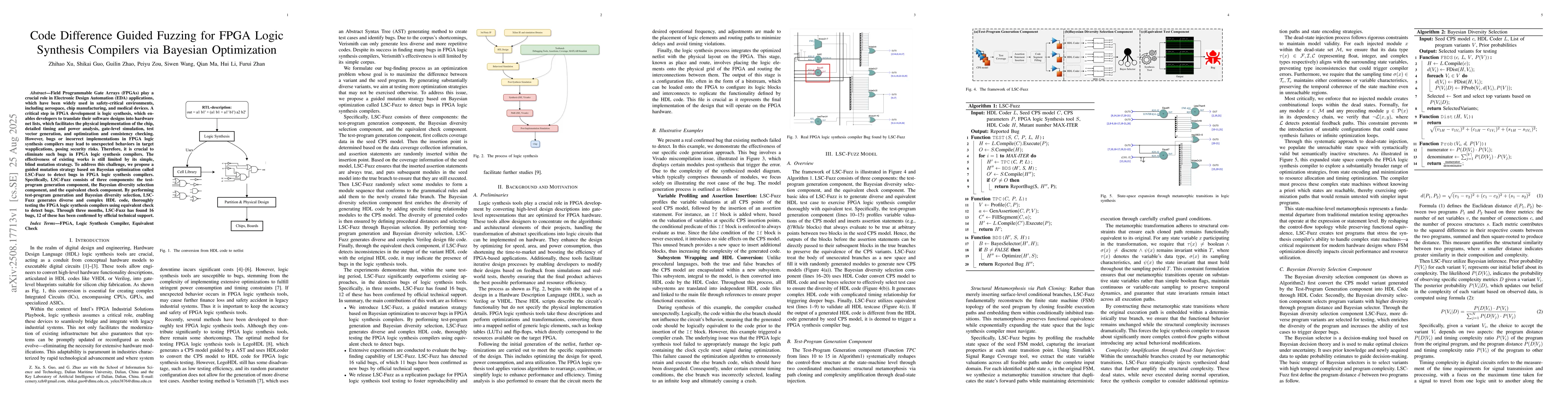 Field Programmable Gate Arrays (FPGAs) play a crucial role in Electronic Design Automation (EDA) applications, which have been widely used in safety-critical environments, including aerospace, chip manufacturing, and medical devices. A critical step in FPGA development is logic synthesis, which enables developers to translate their software designs into hardware net lists, which facilitates the physical implementation of the chip, detailed timing and power analysis, gate-level simulation, test vector generation, and optimization and consistency checking. However, bugs or incorrect implementations in FPGA logic synthesis compilers may lead to unexpected behaviors in target wapplications, posing security risks. Therefore, it is crucial to eliminate such bugs in FPGA logic synthesis compilers. The effectiveness of existing works is still limited by its simple, blind mutation strategy. To address this challenge, we propose a guided mutation strategy based on Bayesian optimization called LSC-Fuzz to detect bugs in FPGA logic synthesis compilers. Specifically, LSC-Fuzz consists of three components: the test-program generation component, the Bayesian diversity selection component, and the equivalent check component. By performing test-program generation and Bayesian diversity selection, LSC-Fuzz generates diverse and complex HDL code, thoroughly testing the FPGA logic synthesis compilers using equivalent check to detect bugs. Through three months, LSC-Fuzz has found 16 bugs, 12 of these has been confirmed by official technical support.
