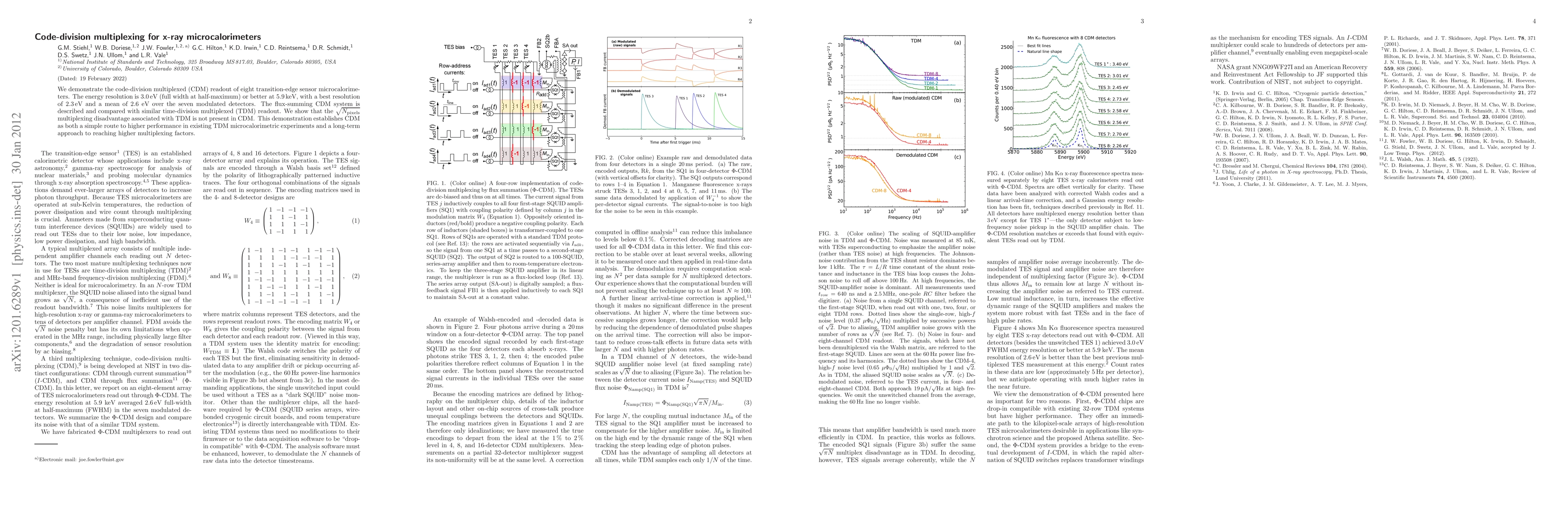 This paper demonstrates the successful implementation of code-division multiplexing (CDM) for reading out eight transition-edge sensor microcalorimeters, achieving an energy resolution of 3.0 eV or better at 5.9 keV. The study shows that CDM outperforms time-division multiplexing (TDM) by avoiding the sqrt(Npixels) multiplexing disadvantage, positioning CDM as a superior method for future high-performance microcalorimetric experiments.