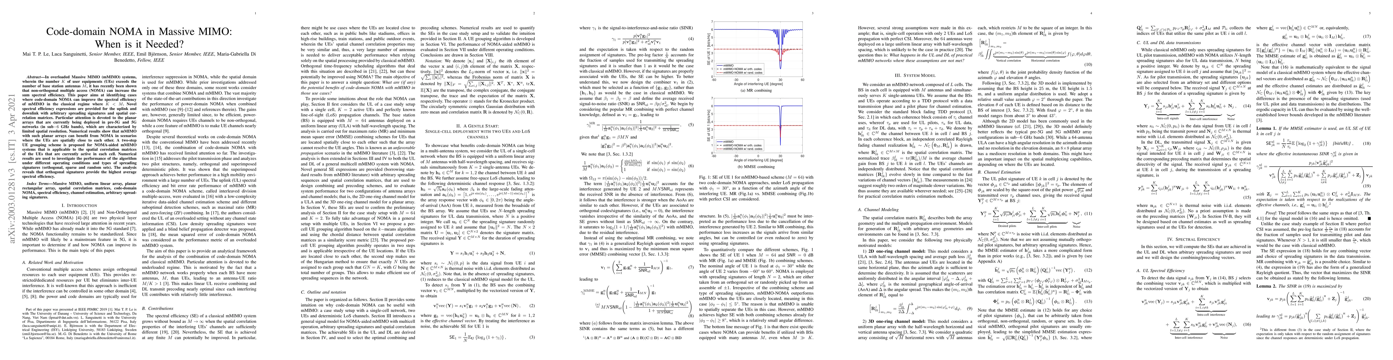 This paper investigates the application of code-domain NOMA in Massive MIMO systems where the number of users exceeds the number of antennas, identifying scenarios where NOMA can enhance spectral efficiency. It proposes a two-step UE grouping scheme for NOMA-aided mMIMO, showing that NOMA benefits systems with spatially correlated users, especially in pre-5G and 5G networks using planar arrays.