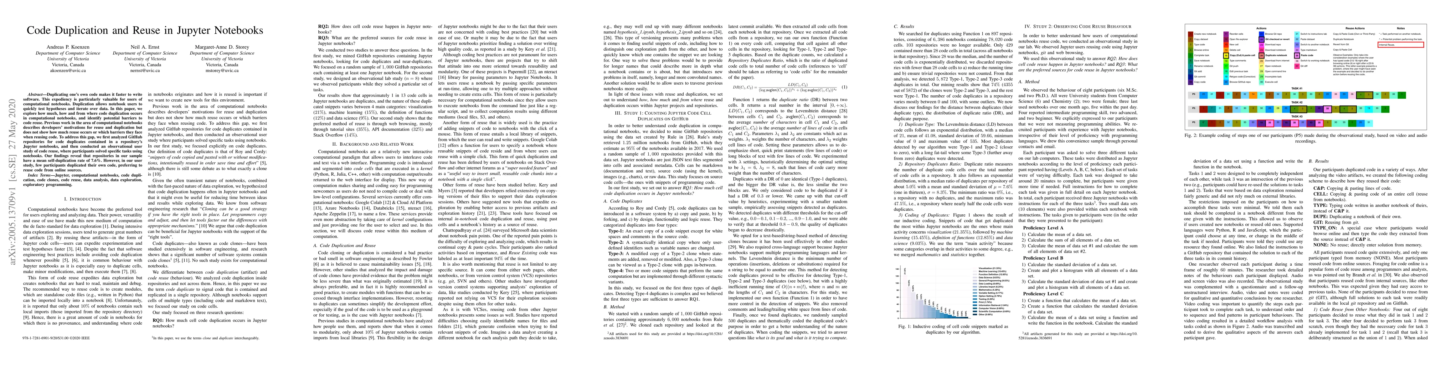 This paper investigates code duplication and reuse in Jupyter Notebooks, finding a mean self-duplication rate of 7.6% in analyzed repositories. However, user study results show that participants prefer reusing external code over duplicating their own, indicating barriers to internal code reuse.