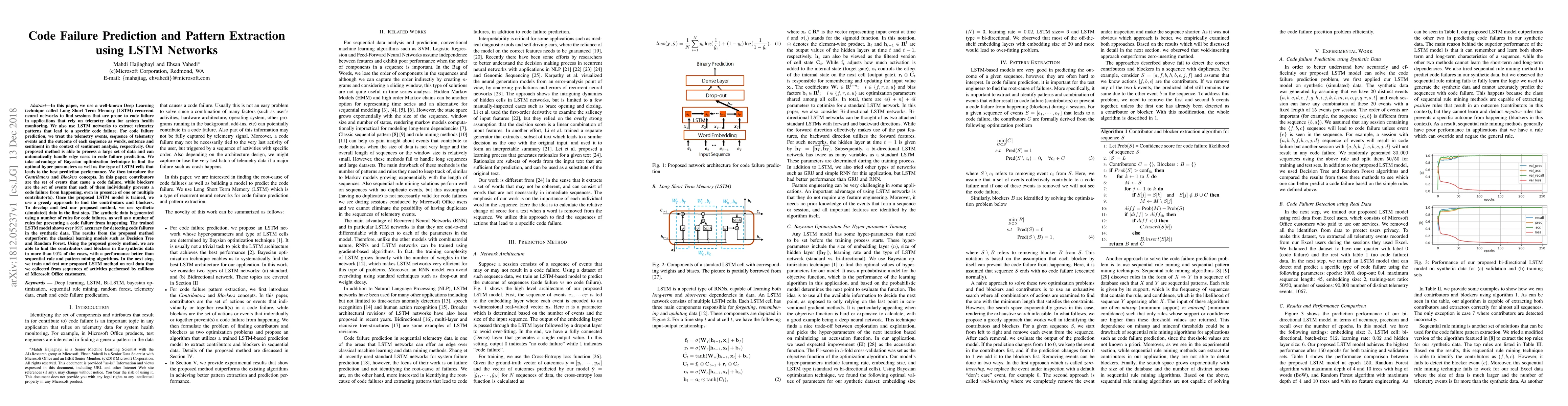 In this paper, we use a well-known Deep Learning technique called Long Short Term Memory (LSTM) recurrent neural networks to find sessions that are prone to code failure in applications that rely on telemetry data for system health monitoring. We also use LSTM networks to extract telemetry patterns that lead to a specific code failure. For code failure prediction, we treat the telemetry events, sequence of telemetry events and the outcome of each sequence as words, sentence and sentiment in the context of sentiment analysis, respectively. Our proposed method is able to process a large set of data and can automatically handle edge cases in code failure prediction. We take advantage of Bayesian optimization technique to find the optimal hyper parameters as well as the type of LSTM cells that leads to the best prediction performance. We then introduce the Contributors and Blockers concepts. In this paper, contributors are the set of events that cause a code failure, while blockers are the set of events that each of them individually prevents a code failure from happening, even in presence of one or multiple contributor(s). Once the proposed LSTM model is trained, we use a greedy approach to find the contributors and blockers. To develop and test our proposed method, we use synthetic (simulated) data in the first step. The synthetic data is generated using a number of rules for code failures, as well as a number of rules for preventing a code failure from happening. The trained LSTM model shows over 99% accuracy for detecting code failures in the synthetic data. The results from the proposed method outperform the classical learning models such as Decision Tree and Random Forest. Using the proposed greedy method, we are able to find the contributors and blockers in the synthetic data in more than 90% of the cases, with a performance better than sequential rule and pattern mining algorithms.