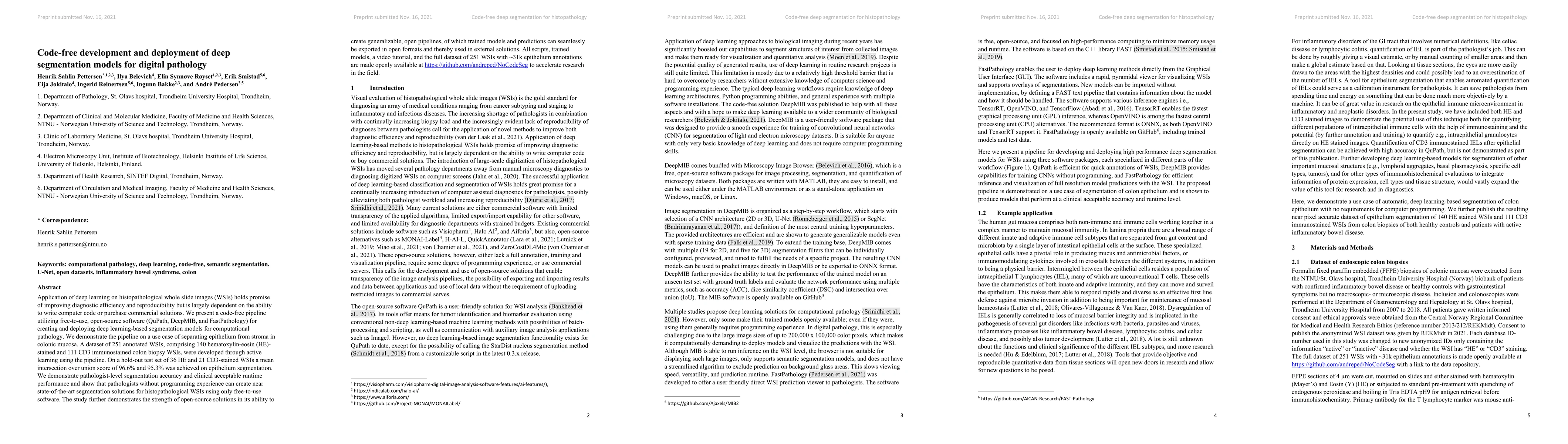 This paper presents a code-free pipeline using open-source software for developing deep learning segmentation models in digital pathology, achieving pathologist-level accuracy in separating epithelium from stroma in colonic mucosa. The open availability of scripts, models, and data aims to accelerate research and democratize access to advanced computational pathology tools.