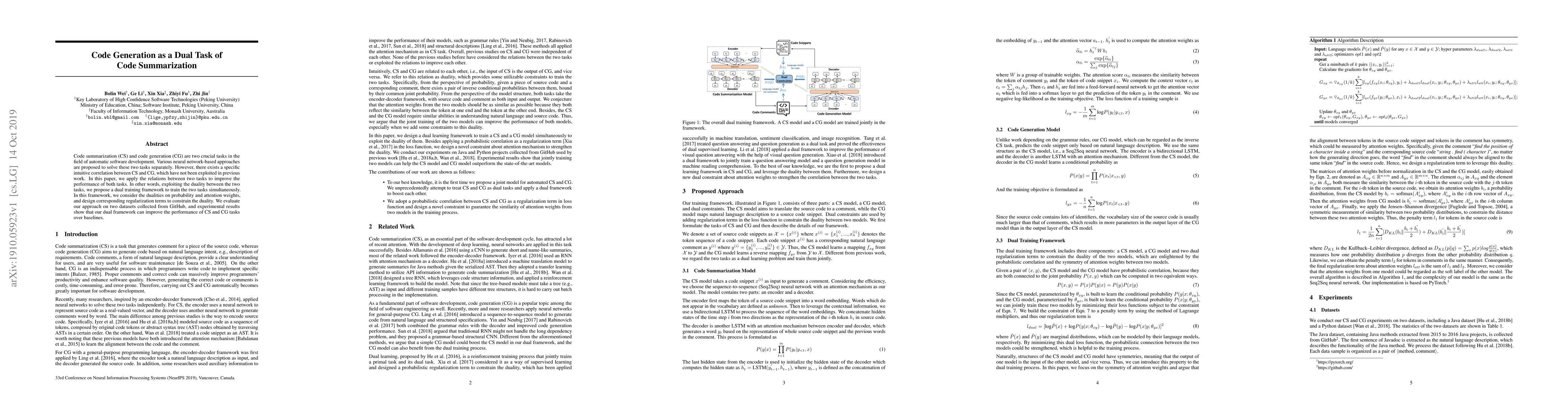 This paper proposes a dual training framework to simultaneously improve code summarization and code generation by exploiting their intrinsic correlation. The framework introduces regularization terms based on probability and attention weights to enforce the dualities between the two tasks, leading to better performance on both tasks compared to separate training approaches.