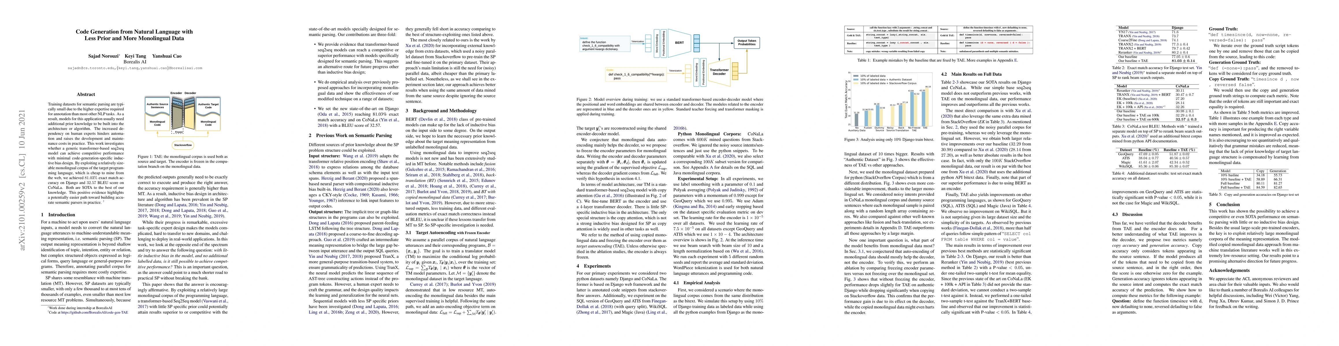 Training datasets for semantic parsing are typically small due to the higher expertise required for annotation than most other NLP tasks. As a result, models for this application usually need additional prior knowledge to be built into the architecture or algorithm. The increased dependency on human experts hinders automation and raises the development and maintenance costs in practice. This work investigates whether a generic transformer-based seq2seq model can achieve competitive performance with minimal code-generation-specific inductive bias design. By exploiting a relatively sizeable monolingual corpus of the target programming language, which is cheap to mine from the web, we achieved 81.03% exact match accuracy on Django and 32.57 BLEU score on CoNaLa. Both are SOTA to the best of our knowledge. This positive evidence highlights a potentially easier path toward building accurate semantic parsers in practice.