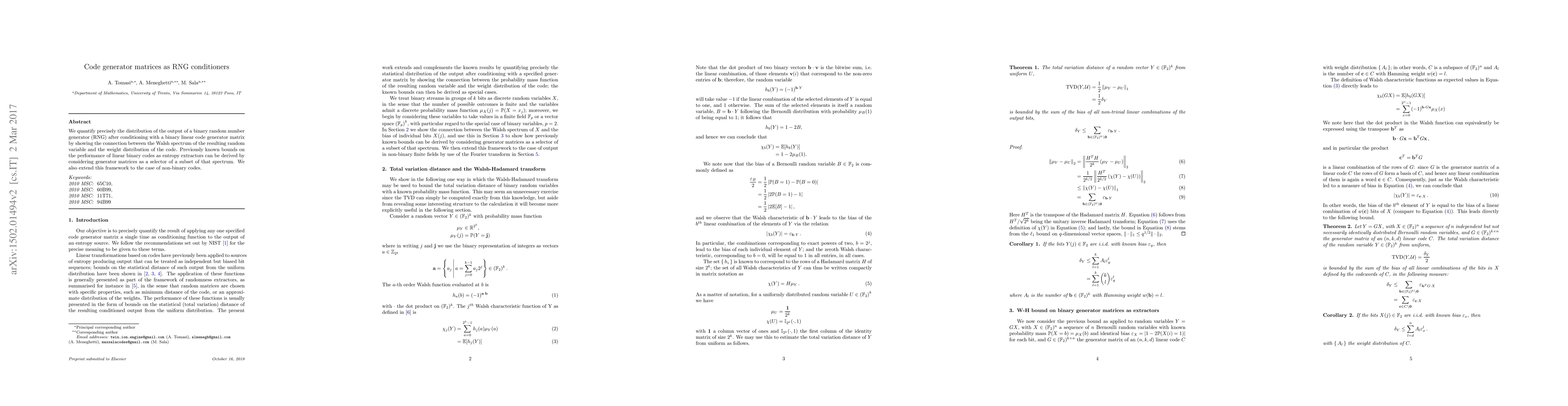 This paper investigates how binary linear code generator matrices condition the output of a binary RNG, linking the Walsh spectrum of the conditioned random variable to the code's weight distribution. It derives previously known bounds on linear code performance as entropy extractors and extends the framework to non-binary codes.