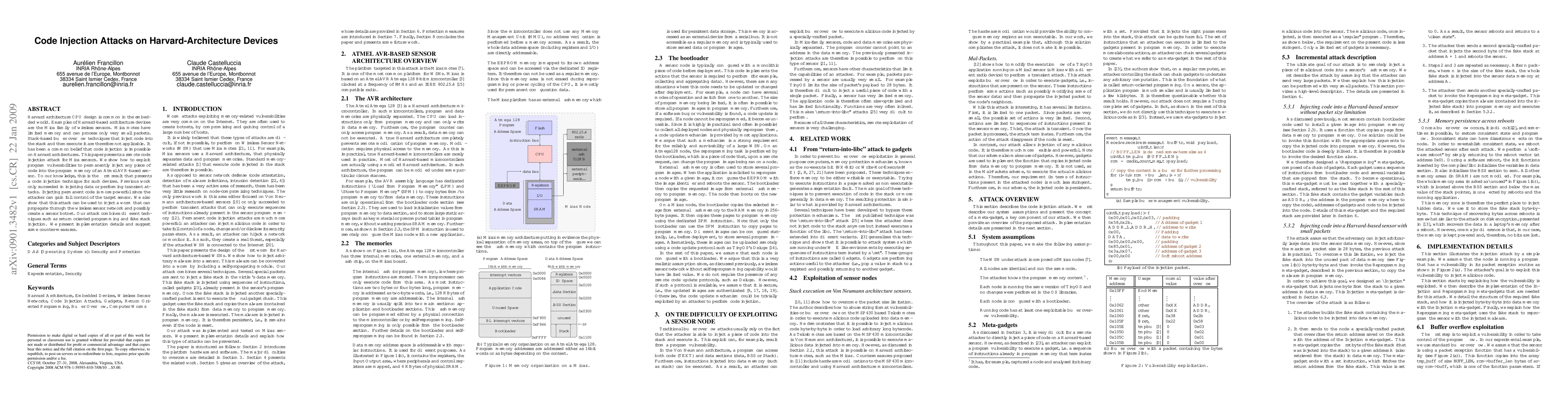 This paper demonstrates a novel remote code injection attack on Harvard architecture-based devices, specifically targeting Atmel AVR-based sensors like the Mica family of wireless sensors. The authors reveal a method to permanently inject code into the program memory, leveraging vulnerabilities and combining techniques like return oriented programming and fake stack injection, which can lead to the creation of a sensor botnet.