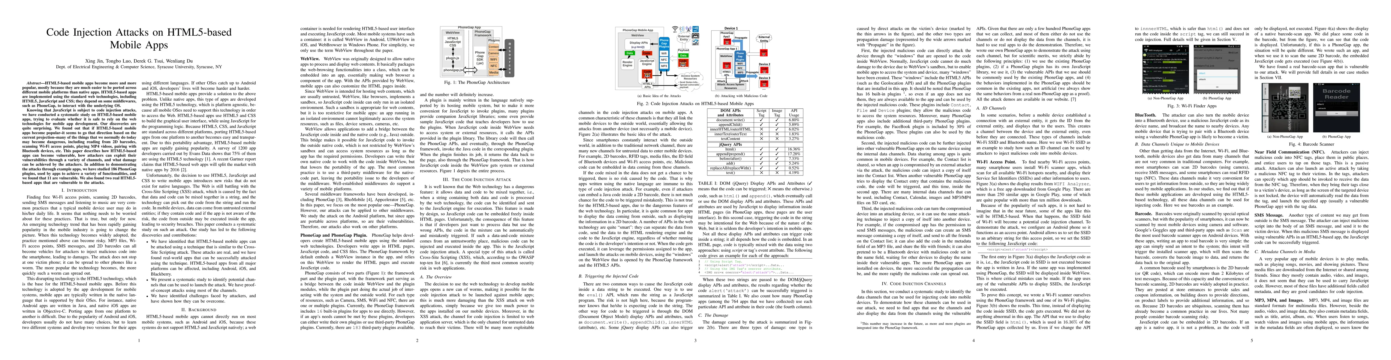 This paper investigates the vulnerabilities of HTML5-based mobile apps, revealing that they are susceptible to code injection attacks similar to those targeting JavaScript. The study found that 11 out of 186 PhoneGap plugins and two real-world apps are exploitable, posing risks to functionalities like barcode reading and Wi-Fi scanning.