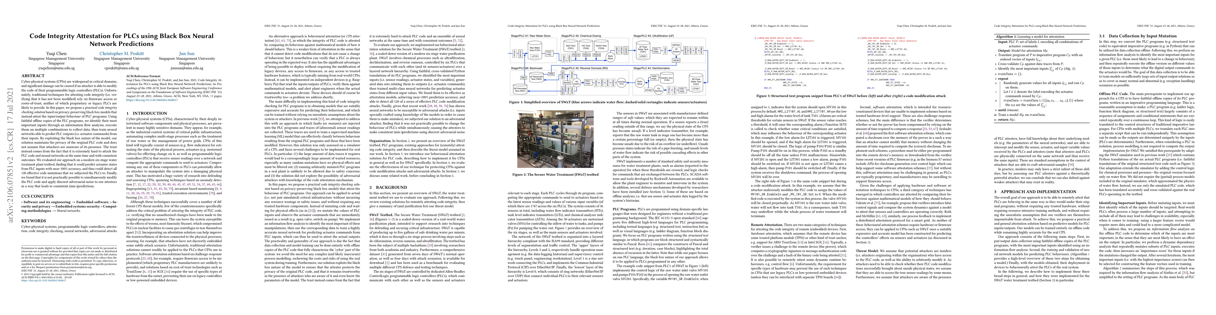 Cyber-physical systems (CPSs) are widespread in critical domains, and significant damage can be caused if an attacker is able to modify the code of their programmable logic controllers (PLCs). Unfortunately, traditional techniques for attesting code integrity (i.e. verifying that it has not been modified) rely on firmware access or roots-of-trust, neither of which proprietary or legacy PLCs are likely to provide. In this paper, we propose a practical code integrity checking solution based on privacy-preserving black box models that instead attest the input/output behaviour of PLC programs. Using faithful offline copies of the PLC programs, we identify their most important inputs through an information flow analysis, execute them on multiple combinations to collect data, then train neural networks able to predict PLC outputs (i.e. actuator commands) from their inputs. By exploiting the black box nature of the model, our solution maintains the privacy of the original PLC code and does not assume that attackers are unaware of its presence. The trust instead comes from the fact that it is extremely hard to attack the PLC code and neural networks at the same time and with consistent outcomes. We evaluated our approach on a modern six-stage water treatment plant testbed, finding that it could predict actuator states from PLC inputs with near-100% accuracy, and thus could detect all 120 effective code mutations that we subjected the PLCs to. Finally, we found that it is not practically possible to simultaneously modify the PLC code and apply discreet adversarial noise to our attesters in a way that leads to consistent (mis-)predictions.