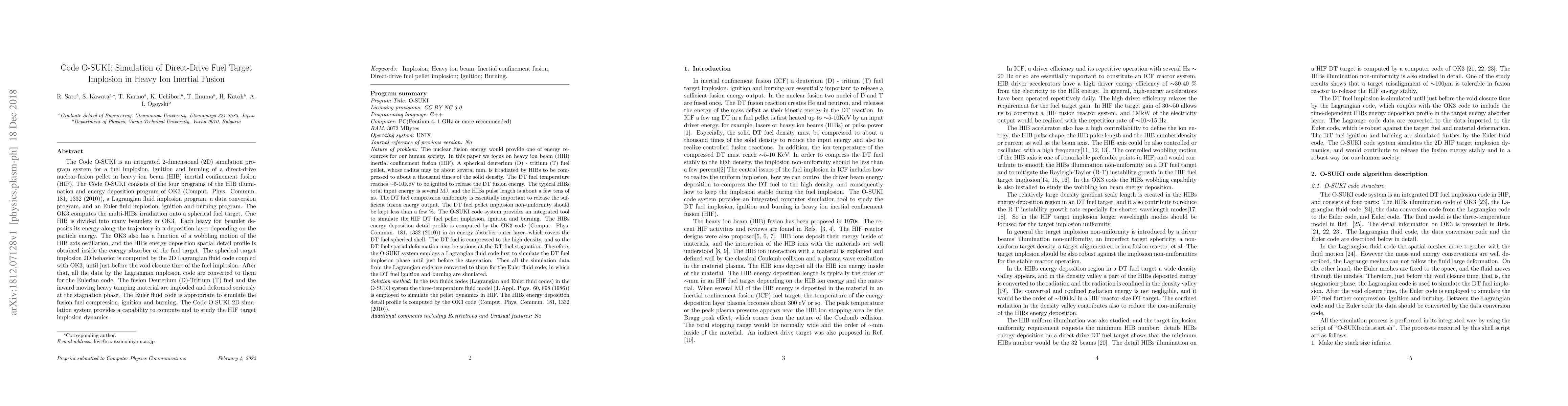The Code O-SUKI is a 2D simulation system for modeling the implosion, ignition, and burning of direct-drive fusion pellets in heavy ion inertial fusion. It integrates four programs to simulate the detailed energy deposition and dynamics of the implosion process, providing insights into the dynamics of heavy ion beam-driven fusion targets.