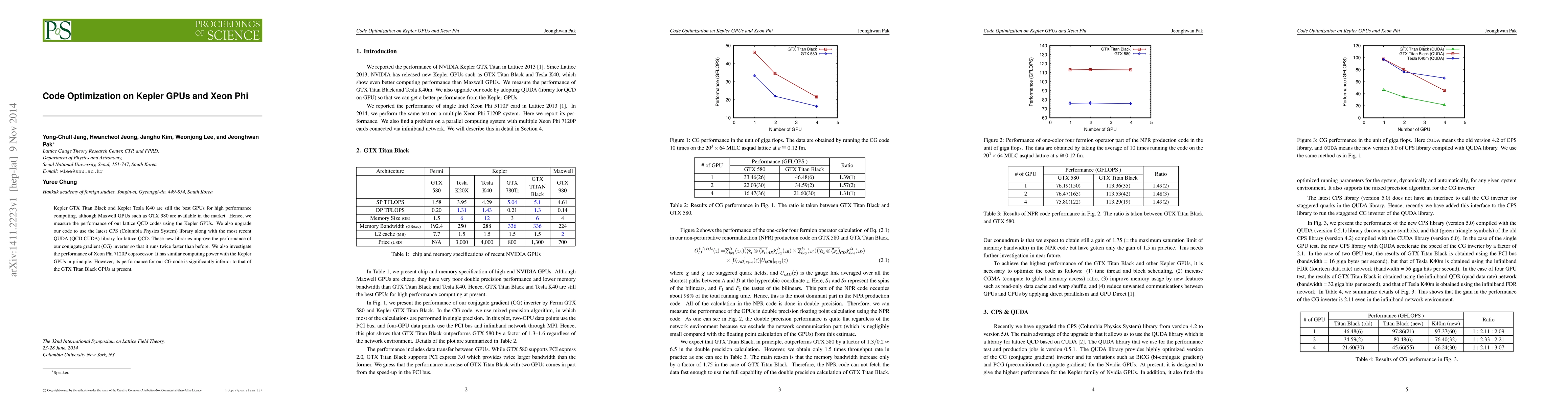 Kepler GTX Titan Black and Kepler Tesla K40 are still the best GPUs for high performance computing, although Maxwell GPUs such as GTX 980 are available in the market. Hence, we measure the performance of our lattice QCD codes using the Kepler GPUs. We also upgrade our code to use the latest CPS (Columbia Physics System) library along with the most recent QUDA (QCD CUDA) library for lattice QCD. These new libraries improve the performance of our conjugate gradient (CG) inverter so that it runs twice faster than before. We also investigate the performance of Xeon Phi 7120P coprocessor. It has similar computing power with the Kepler GPUs in principle. However, its performance for our CG code is significantly inferior to that of the GTX Titan Black GPUs at present.