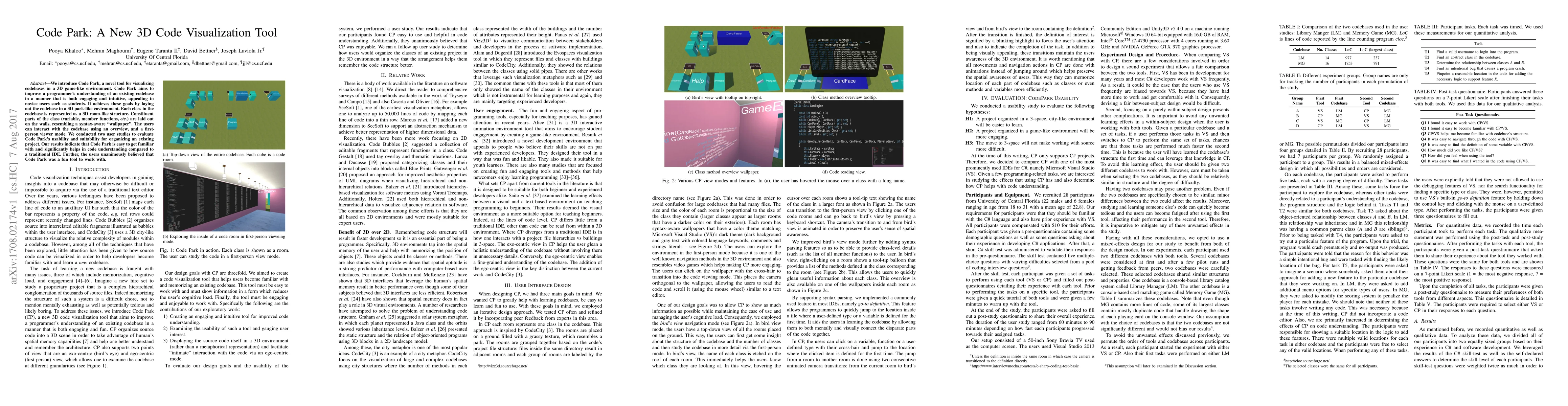Code Park is a 3D visualization tool that represents codebases in a game-like environment, helping users understand code structures intuitively. User studies show it is easier to use and more engaging than traditional IDEs.